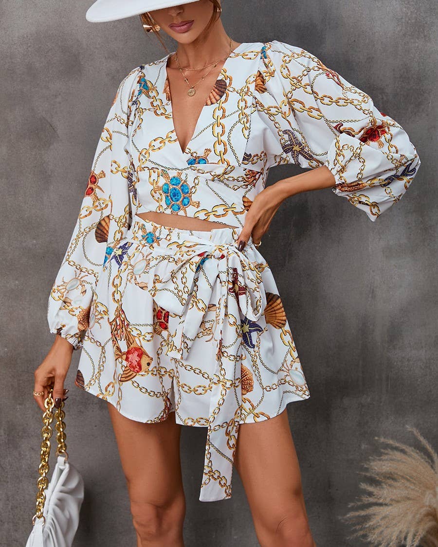 wonderland print polyester blouse pants 2 piece set