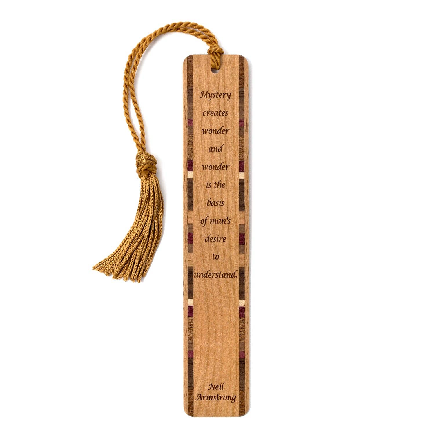 This bookmark showcases the stunning natural grain of cherry wood at its center, bordered on both sides by intricately crafted inlays made from a variety of domestic and exotic hardwood combinations. The laser engraving features an inspiring quote beautifully engraved by Henry David Thoreau. The reverse side of the bookmark is left blank, allowing the natural beauty of the cherry wood grain to shine. The inlay accent combinations will vary, ensuring each bookmark is one of a kind. A braided tassel complements the design.