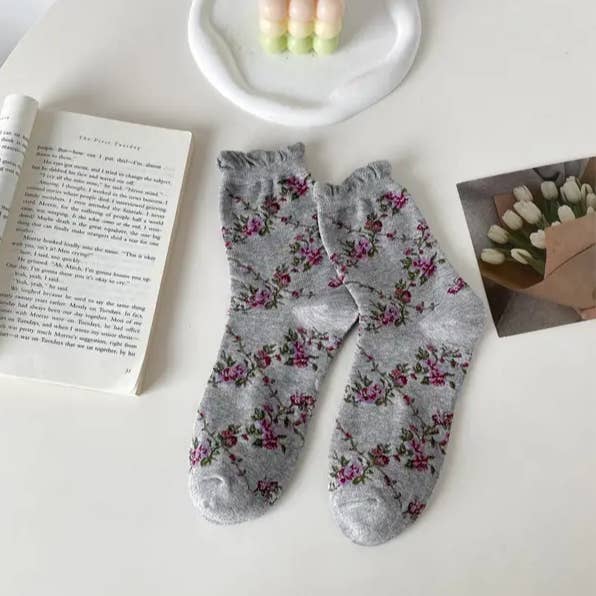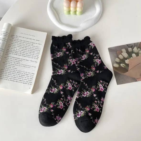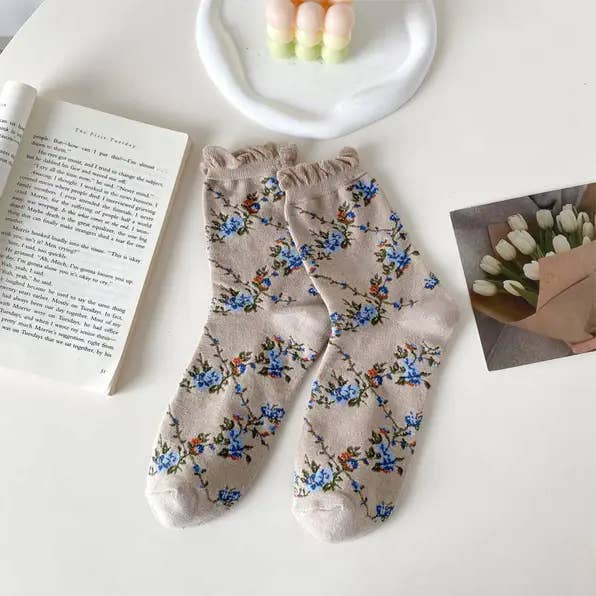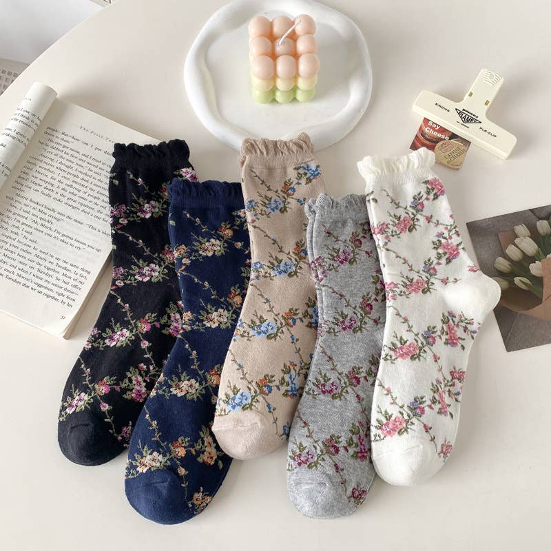 Fabric name: cotton Function: sweat absorption Pattern: color matching, plants and flowers Packaging form: bag Applicable gender: female Main fabric composition: cotton Tube height: medium tube Needle count: 200N Suitable season: all seasons Product category: ordinary casual socks Size: one size fits all Main fabric composition content: 70% (inclusive) -80% (exclusive) Weaving method: single needle