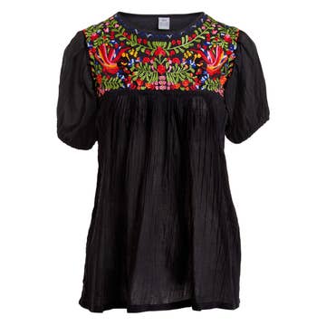 This Raj Embroidered Top made of light breezy Indian cotton and allows your skin to breathe on a hot summer day. Flowy fit with stitch detailing on the sleeves and neckline.
