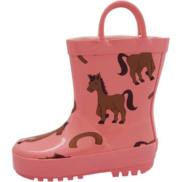Buy the 12 unit prepack: size run 6-7-8-9-10, size scale 2-2-3-3-2. Lightweight Rubber Boots That are Fun to Wear Kids look forward to rainy days when they can wear these rainboots with the big, easy-to-grab rubber handles. They're so easy for small hands to pull on by themselves and they come in 12 exciting color combinations and patterns- something to please every girl and boy from toddlers and little kids to big kids. Fully Waterproof With Excellent Traction There's no slipping and sliding around on the wet grass in these boots. The deep, rugged lug soles provide superior grip for every muddy puddle and slippery slope. Kids can run around outside all day stomping puddles Easy Clean Up A quick swipe with a damp cloth after a long, wet day and these rainboots are ready to go again. Hang them by the handles to dry or even hook them to a backpack for convenience.