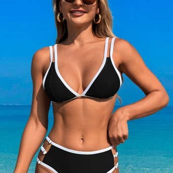 This set boasts a halter neck bikini top with "BODY" printed on each triangle cup, creating a striking and athletic appearance. Paired with high-waisted shorts featuring faux pocket details and contrasting stitching, this ensemble exudes a rebellious and edgy vibe. The combination of the bikini top and shorts forms a cohesive and fashionable outfit, ideal for making a bold statement.