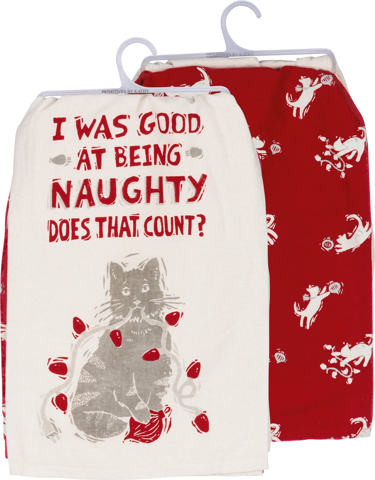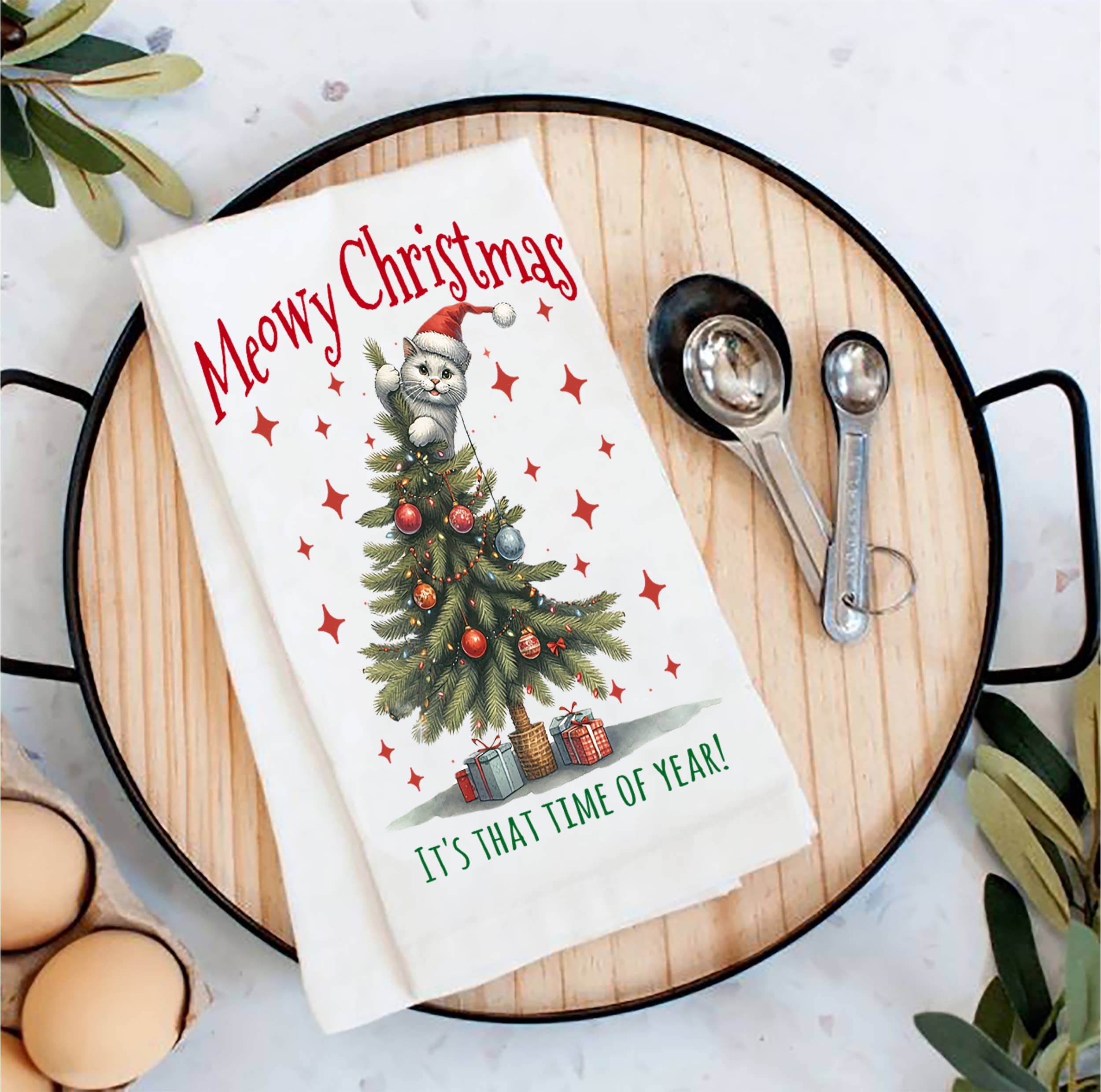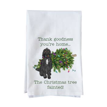 A cotton kitchen towel featuring "Thank God You're Here…The Christmas Tree Fainted!" sentiment with festive dog and tree design. Machine-washable.