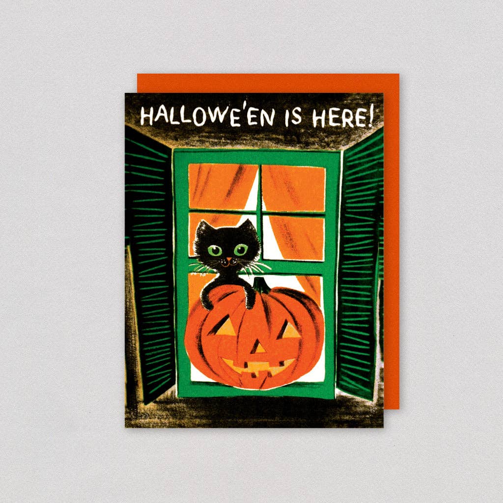 Our boxed Halloween Cards include (6) identical cards and (6) coordinating gray euro flap envelopes, enclosed in our ultra-premium keepsake box. Our box features a clear window, accented with a gold foil pressed border, a magnetic closure, and includes a content label on the backside of the box. It can be stood up on end, vertically or horizontally, and of course on its’ back, giving retailers maximum flexibility in store. Boxes are manufactured in China. Our cards are A2 (4.25” x 5.50”) in size, are flat printed + stamped with gold foil on 100# cover. The cards come with blank white interiors and are printed in the United States.