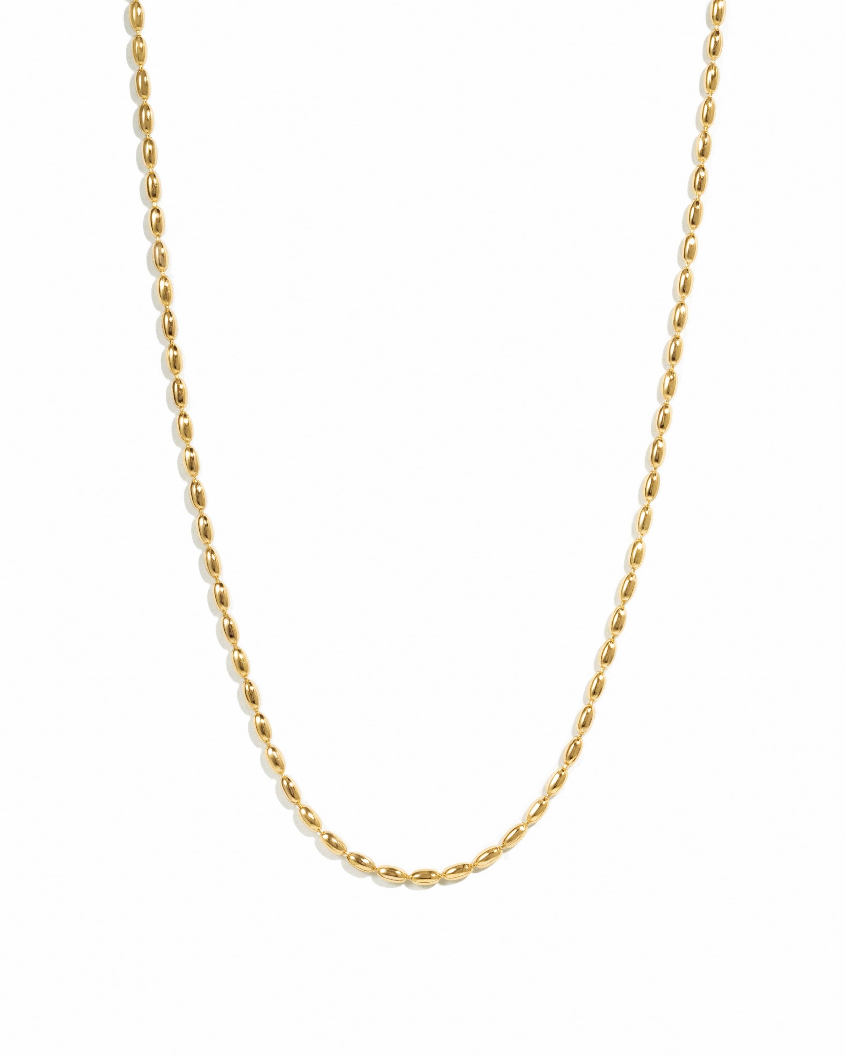 The Laguna Pearl Necklace is a dainty pearl necklace made of high quality, hypoallergenic gold vermeil (gold fill over sterling silver). Chain measures 16" with an extender up to 18". Necklace uses genuine high quality freshwater pearls. Mauve Jewelry Co.