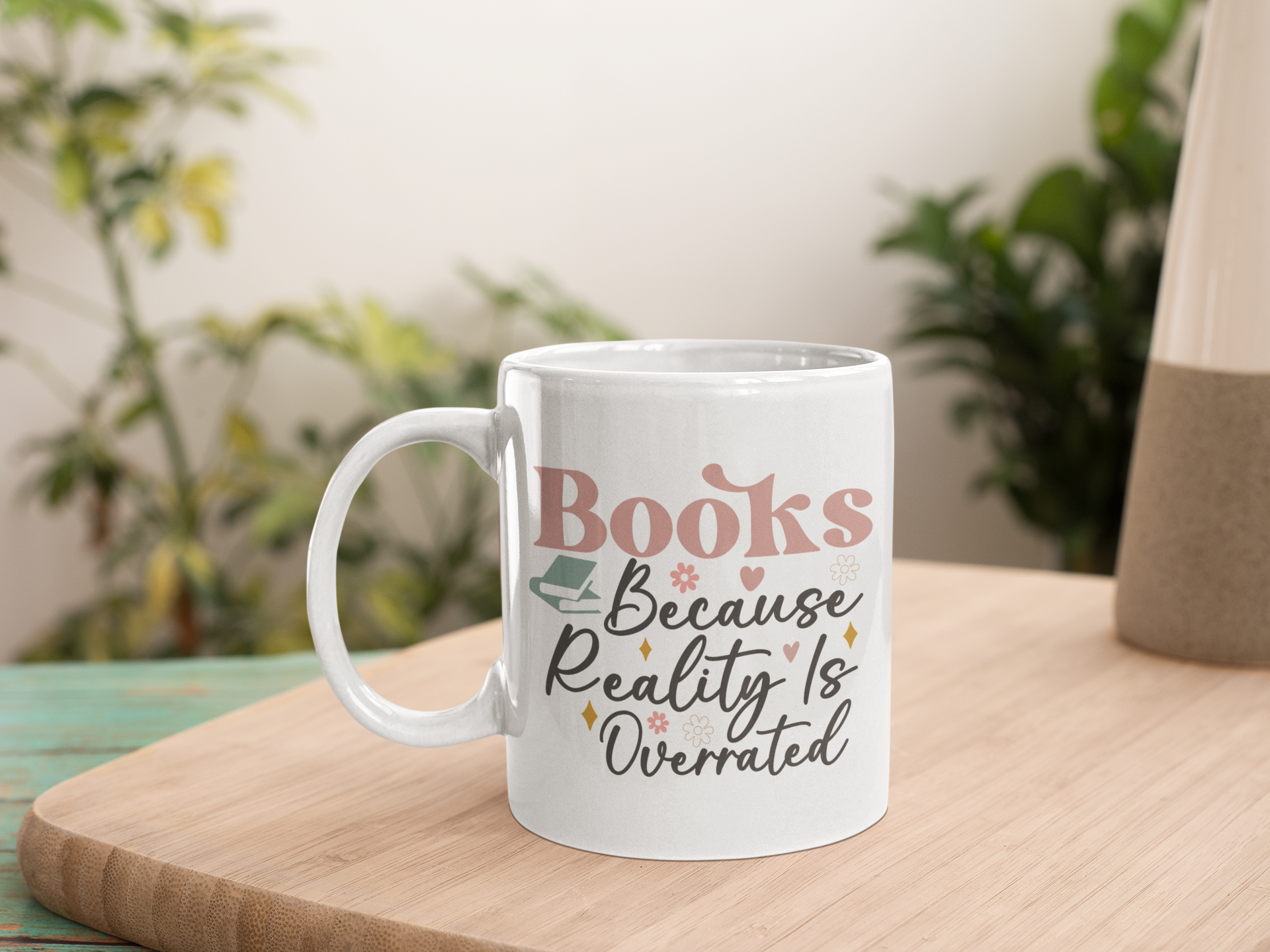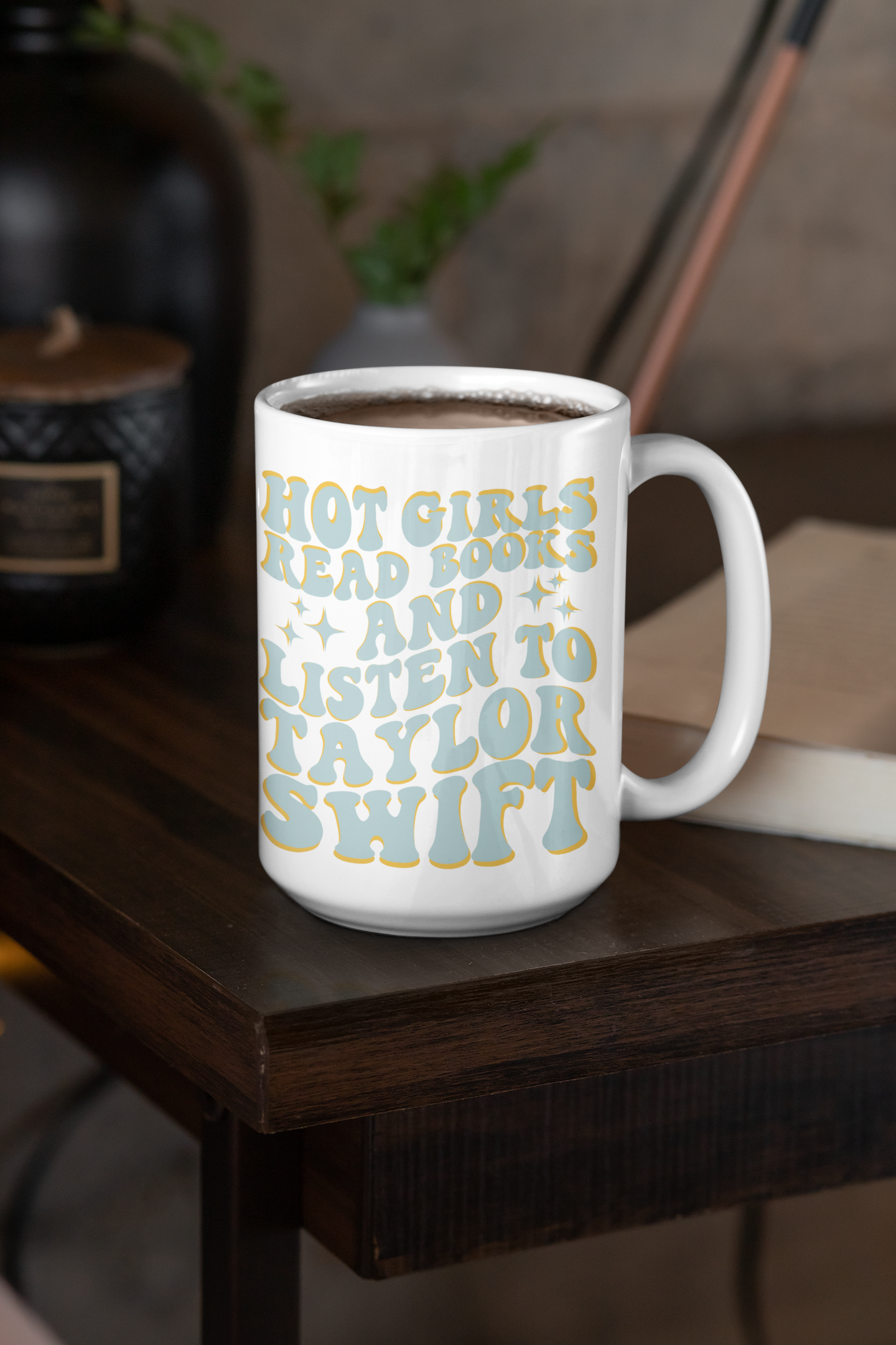 One 15oz ceramic mug designed with "Hot Girls Read Books" in a yellow bubble font and pink outline. Dishwasher safe. Please note that all mugs are printed, hand pressed and designed by us, so there might be some slight variations in style.