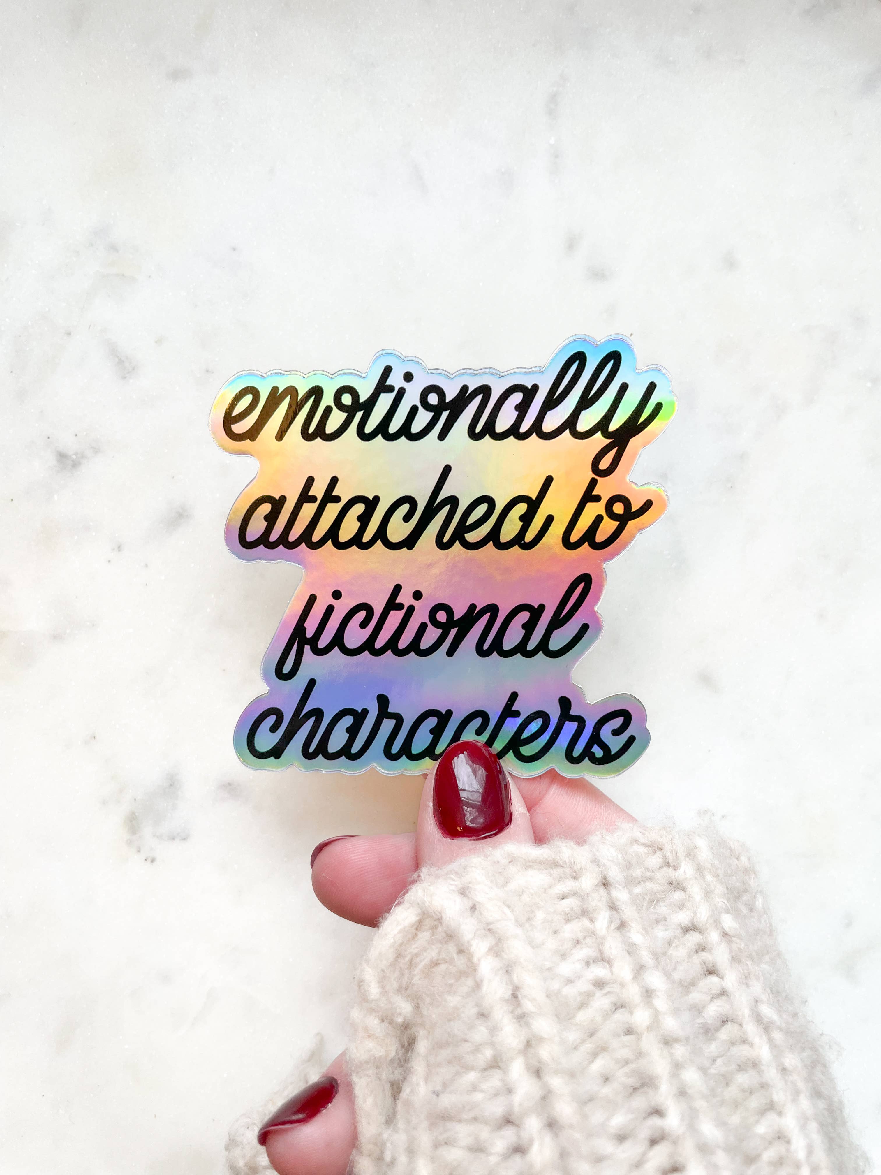 DESCRIPTION Wear your bookish heart on your sleeve with our Emotionally Attached To Fictional Characters Bookish Sticker. Let the world know about your deep connections with beloved literary figures. Stick it on your phone, laptop, or bookshelf to showcase your passion. DETAILS Printed in full color Weatherproof Easy to remove with little to no residue Made in Brooklyn, New York