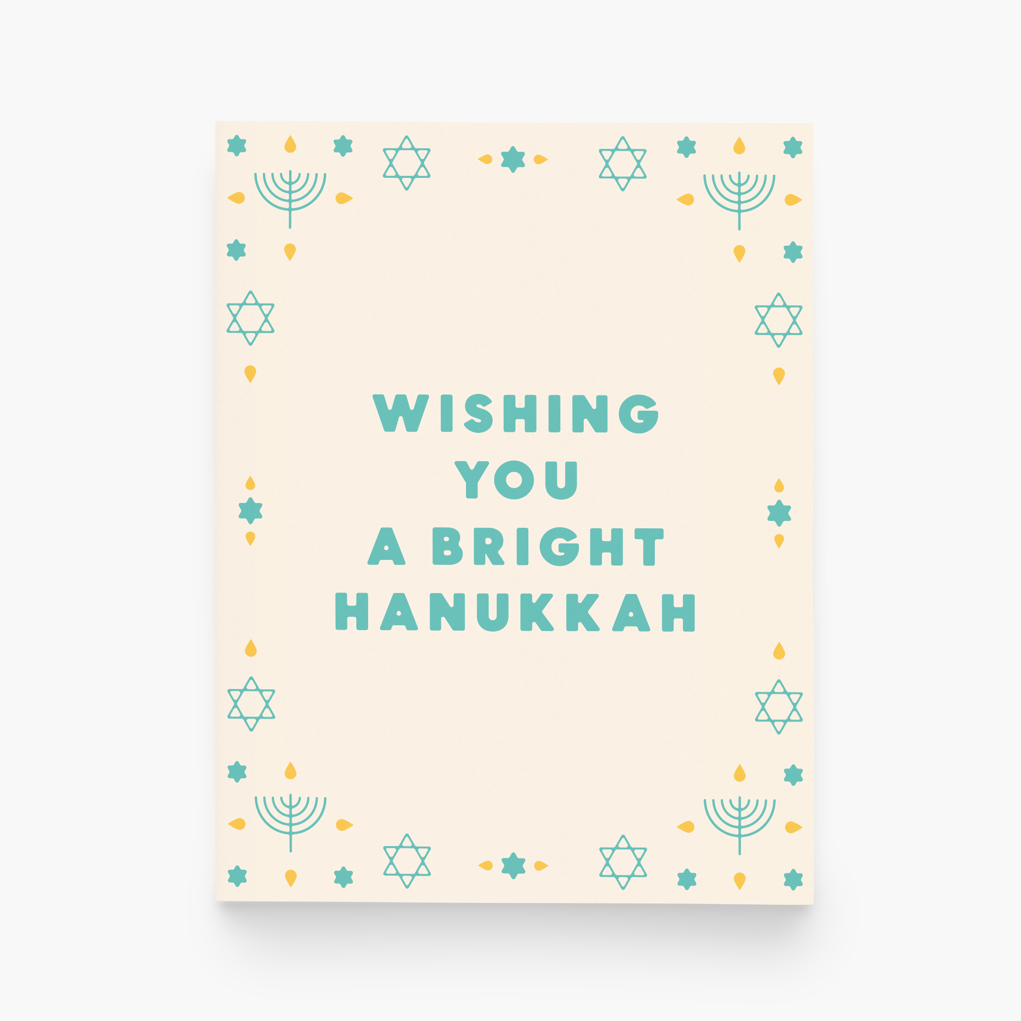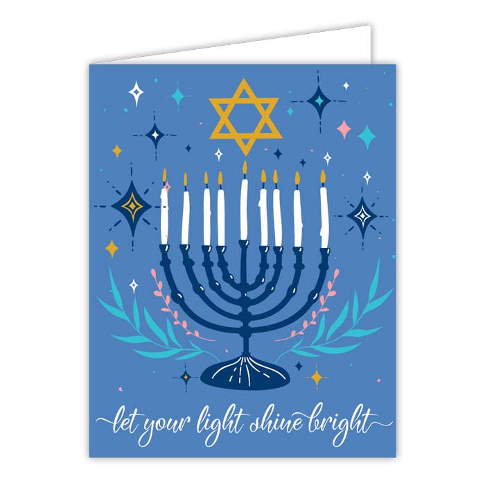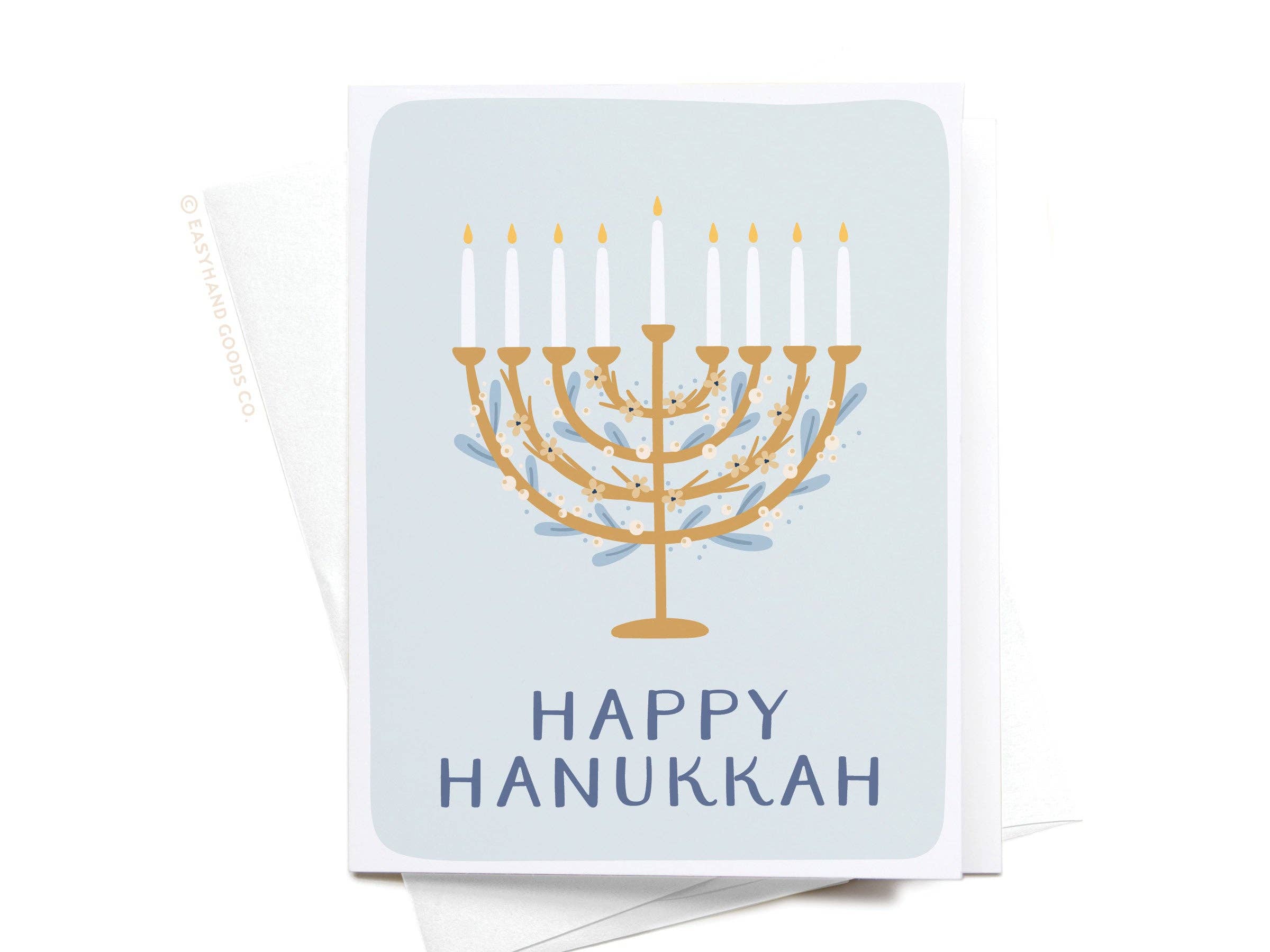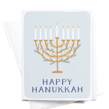 "Hoppy Hanukkah" handlettering with a watercolor illustrated frog hopping by with a menorah. A2 card with an original watercolor illustration printed on 130 lb paper. Comes with a blue deep-flap paper envelope in a protective cellophane sleeve. Size: A2 (4.25" x 5.5")
