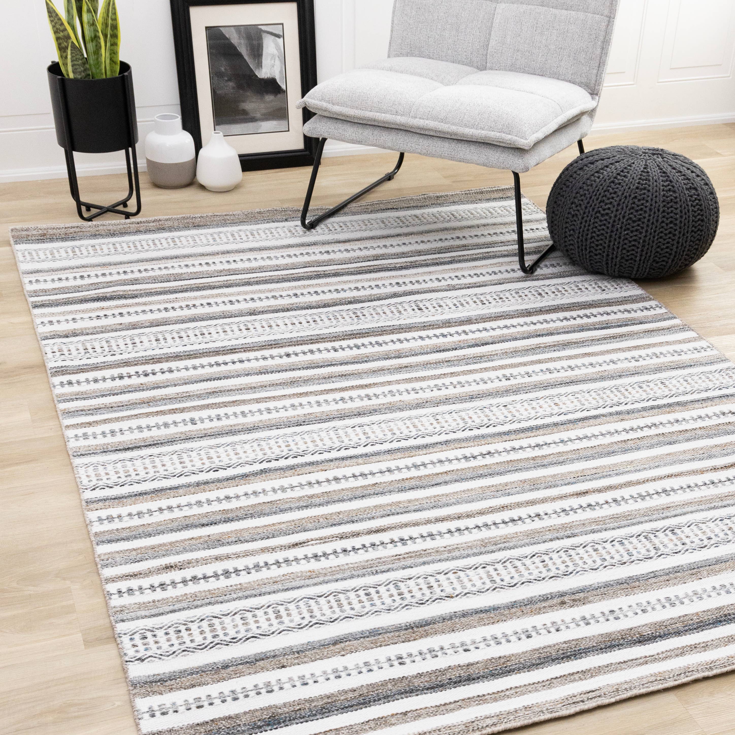 5' x 7' Grey & White Striped Handwoven Indoor/Outdoor Cabana Style Stain Resistant Area Rug Spring Décor, Fall Décor.