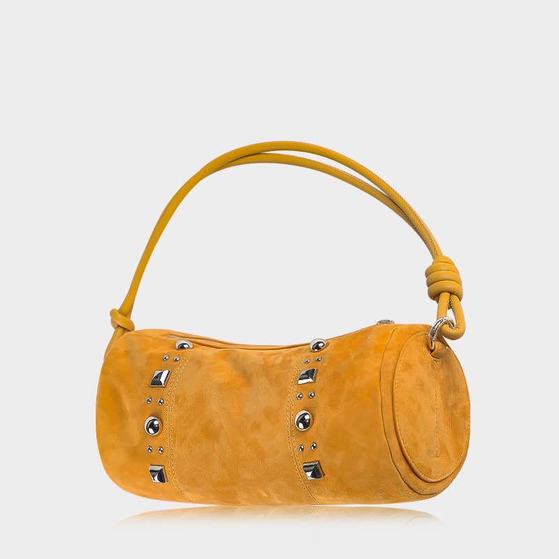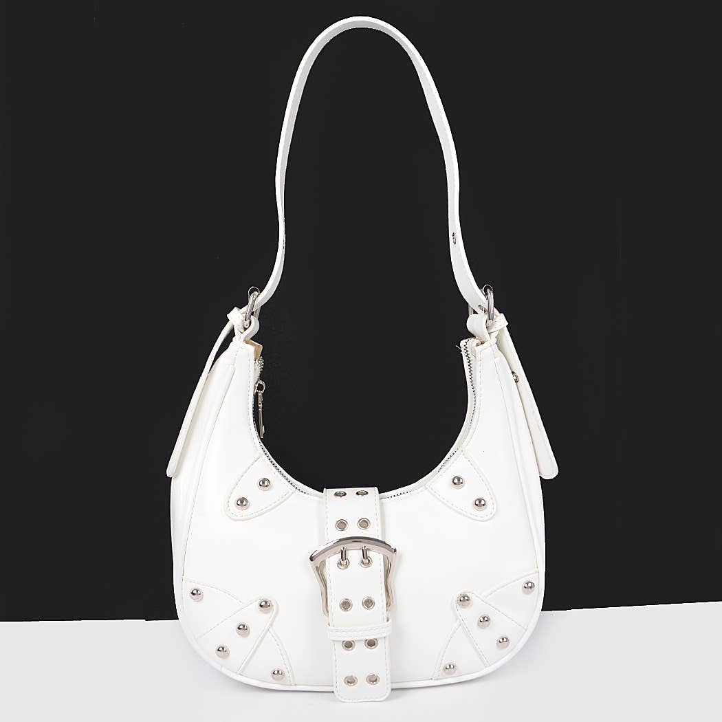 This shoulder bag showcases a unique faux leather studded trim style. Unveil modern elegance with this subtly intricate shoulder bag. This shoulder bag approximately measures (Inches): L: 10.5 Depth: 4 H: 5.5 90% PU 10% ALLOY