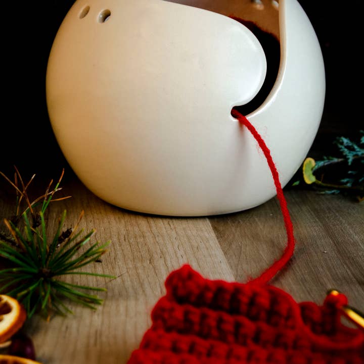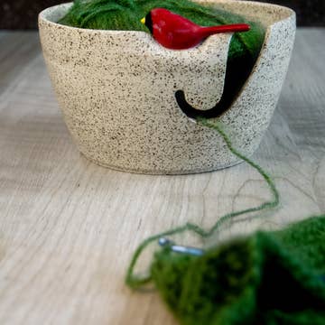 Keep yourself company and keep your yarn neat while you knit, crochet or weave with this ceramic birdie yarn bowl. Top your yarn bowl with one of three delightful birdies: Chickadee, Cardinal, or Sparrow. Thrown in stoneware on the wheel and then altered and topped with the hand-painted Chickadee, Cardinal, or Sparrow, this yarn bowl is fun and functional. The deep 'j' hook keeps your yarn from slipping, and the adequate size accommodates various yarn ball sizes. Bowl dimensions are 6 inches diameter by 3.5 inches deep. Flat foot helps keep bowl stable while working. Handmade in Western New York.