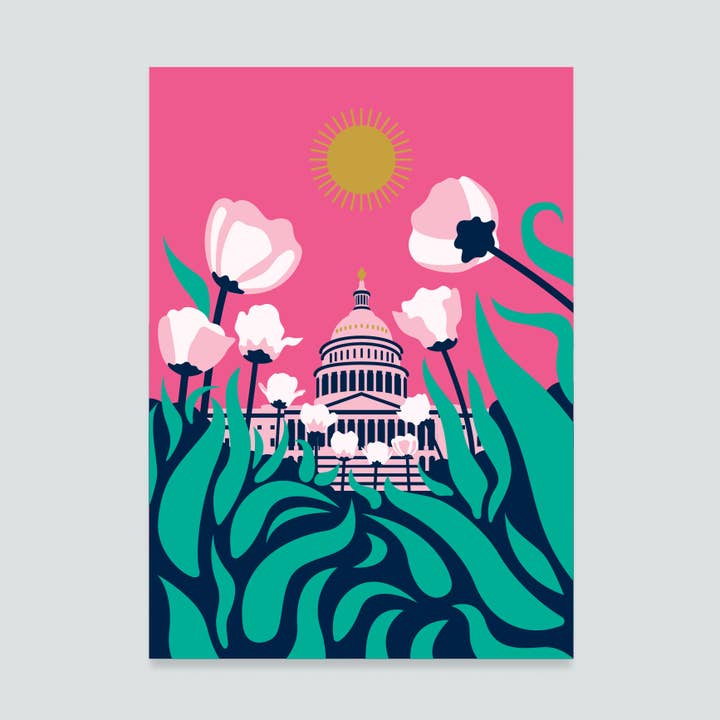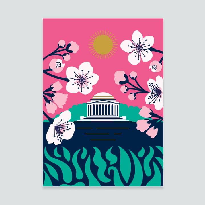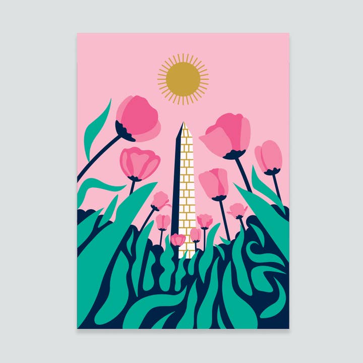 4.13W x 5.83H inch postcard, giant panda bear reading a book surrounded by falling autumn leaves in front of the Washington Monument in Washington, D.C.