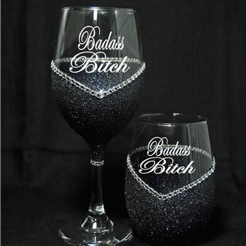 Wholesale Badass Bitch – Bling Glitter Glass Wine Glass (The Bitch Collection)