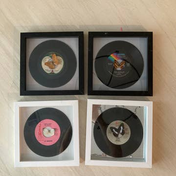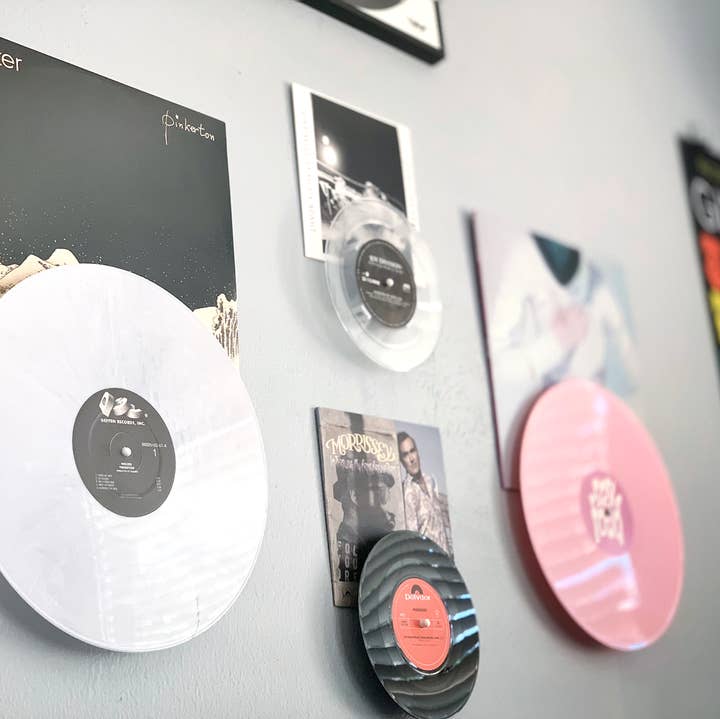 Designed with heart in Houston, Texas. Display vinyl records on a wall or tabletop with the most versatile album display system. Record Props showcase vinyl records in multiple ways, quickly and easily with no need for frames or shelves. + Display what is now playing on a tabletop or wall. + Switch between Wall Mount and Tabletop display in seconds. + Pair a record with its album cover on the wall like a piece of art. + No frames. Albums appear to be floating on the wall. + Quickly change records and continue playing your favorite music. + Requires only a single screw for the wall mount option (included) Each package contains our three-piece-display system and wall mounting hardware.