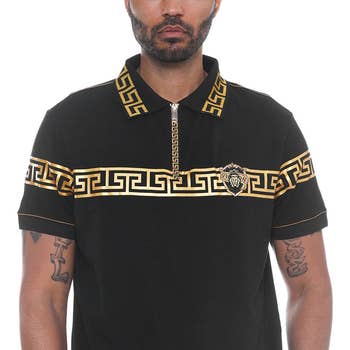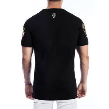 Mens Short Sleeve Slim Fit T-Shirt Black With Gold Greek Bull Horns Embroidery Rhinestones. 100% Cotton stretch fabric. Made in turkey. LAV-94661 Comes as A-Pack: 1-S, 2-M, 2-L, 1-XL or B-Pack: 1-M, 1-L, 1-XL, 1-2XL, 1-3XL, 1-4XL