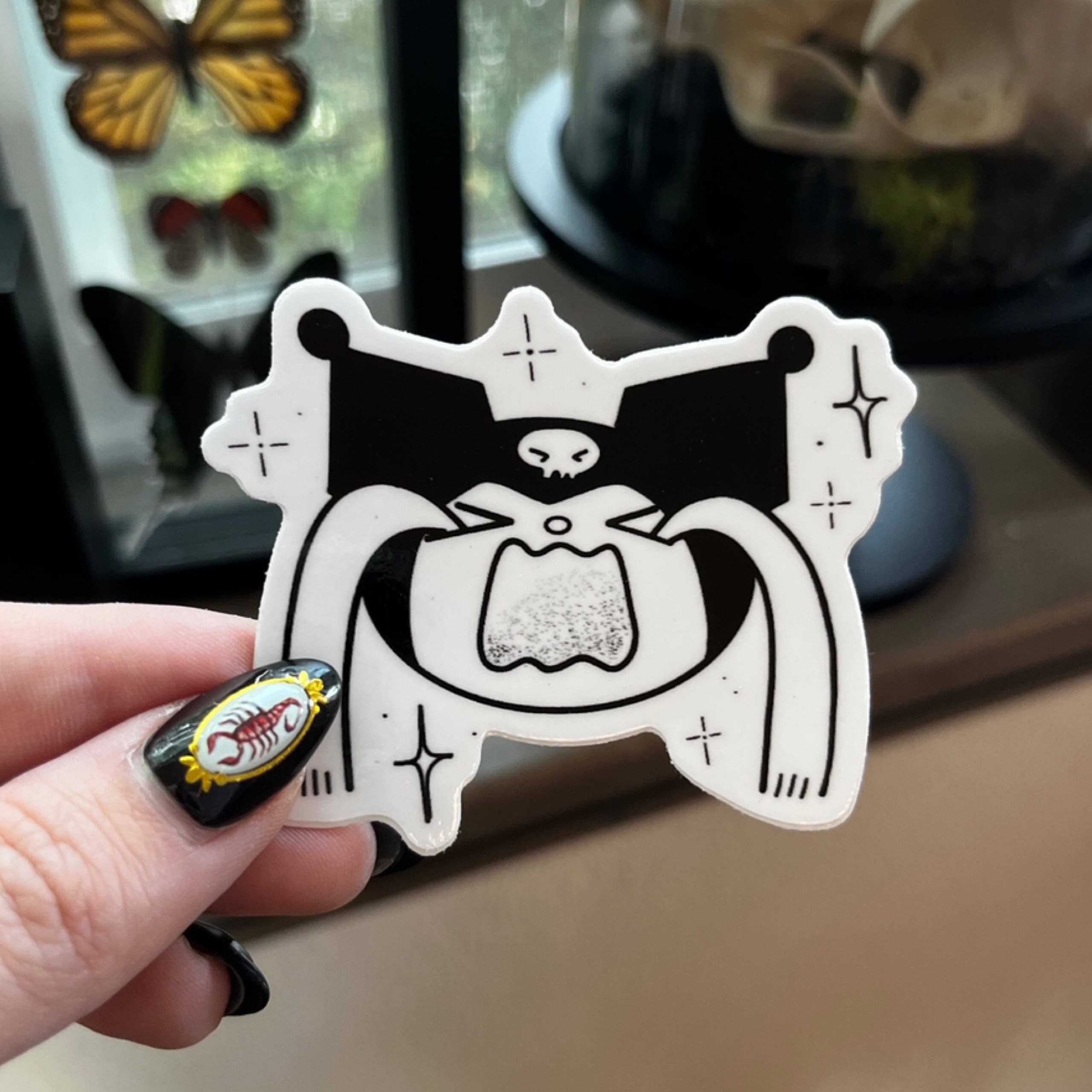 A fun mashup of the once-ubiquitous bongo cat and your favorite in-house rogue! All of our stickers are printed and cut in-house and by hand. Each sticker is printed on high-quality vinyl sticker paper using only the best inks. The stickers are then laminated and kiss-cut. Stickers measure 2.5" on the longest side! Our stickers are durable and waterproof and work just as well being placed outdoors as in. They make great additions to water bottles, laptops, or just about anything else with a clean flat surface to stick to. Sticker orders will be shipped out the day after they are ordered! We maintain stock of all items listed, and have the ability to produce as many stickers as you might need! These make a great addition to any checkout counter as a way to increase the average order value in your shop!