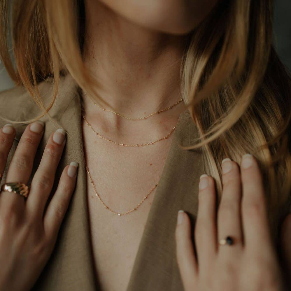 • Available in 14k gold-filled OR 14k rose gold filled with sterling silver fixed balls • 21" length