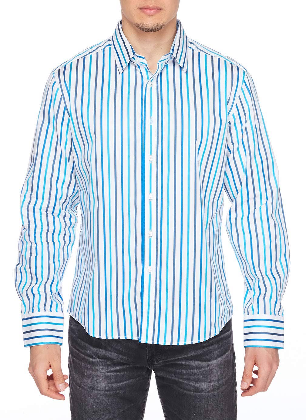 Slim fit. Base is raised to a twill weave. Yarn spun to a super fine 100's double plied. Pre-shrunk. Cutaway collar - with contrast piping. Convertible cuffs - buttons or cuff links.