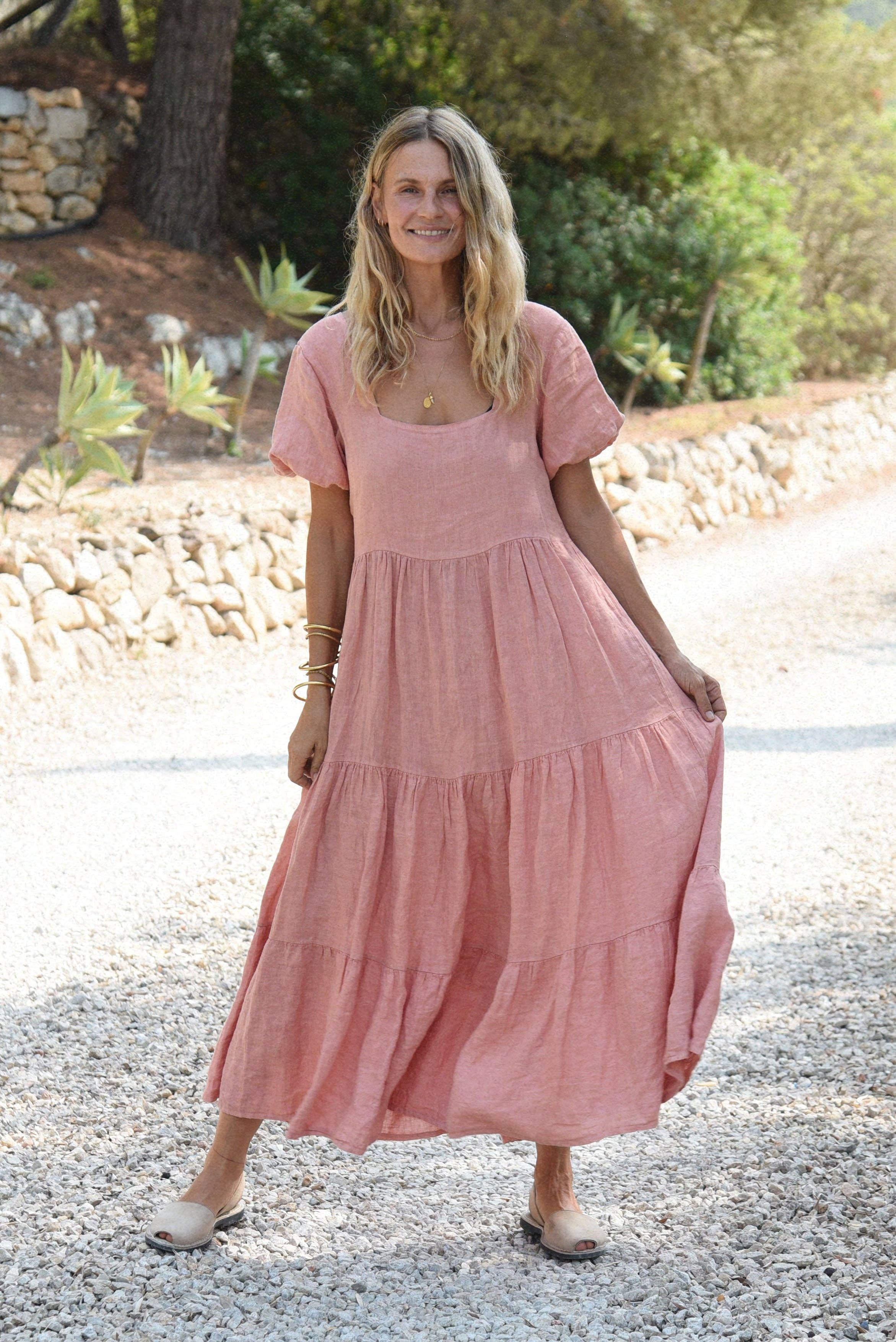 The Srikandi dress is a captivating piece, thoughtfully handcrafted by our skilled artisans in Bali. Its exquisite layered ruffles are designed to move fluidly with you, transforming every step into an elegant statement, ensuring all eyes are on you. Named after Srikandi, the iconic female warrior from the Hindu epic Mahabharata, this dress embodies her courage, strength, and wisdom. In contemporary Indonesia, Srikandi has become a symbol of women's liberation, representing independence and empowerment. DETAILS Composition: 100% Deadstock Cotton Color: Sienna Brown Button-down closure Long dress Pleated design Crafted in Bali with a touch of Californian flair Inka Williams is 5'5" and wears a size small. Cotton with a Past Life Our deadstock cotton is sourced from leftover fabric originally produced for larger fashion houses—unused, but full of potential. By repurposing this high-quality material, we reduce textile waste and create something new without additional environmental impact. Soft, breathable, and naturally limited in quantity, each batch brings its own unique story to the pieces we make.