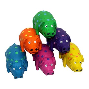 * 12" pig-shaped stuffed dog toy in soft dotted fabric. * Made of super-soft, durable plush in vivid colors. * Embroidered details provide realism while being safe for play. * Lined with tough mesh netting and sewn with seam stabilizers, dogs just can't chew right through! * Filled with thick stuffing and noisemakers for doggie fun. * Only the best and longest-lasting noisemakers are used. * MUST BE ORDERED IN MULTIPLES OF 4
