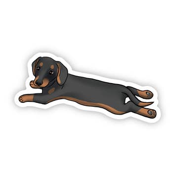 Bring some fun to your day with this charming weenie dog vinyl sticker, perfect for adding personality to your laptop, water bottle, or journal. Made from durable, weatherproof vinyl, it's a must-have for Dachshund lovers everywhere! - Approx size: 1.35" x 3" - Material: Heavy-duty vinyl - Dishwasher and microwave-safe - Weatherproof and waterproof Painted & designed by KelseyMDesigns, a woman-owned company based in Denver, Colorado and printed in the USA