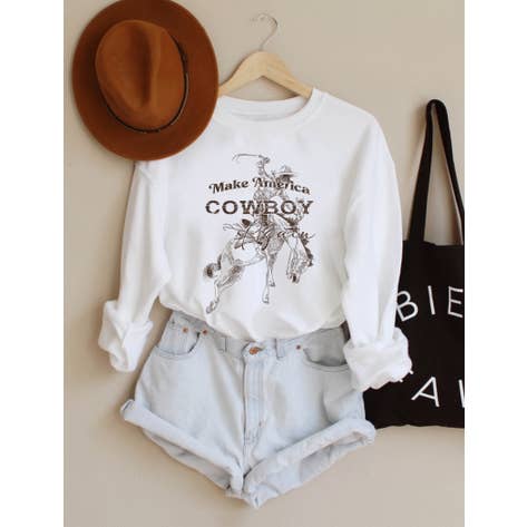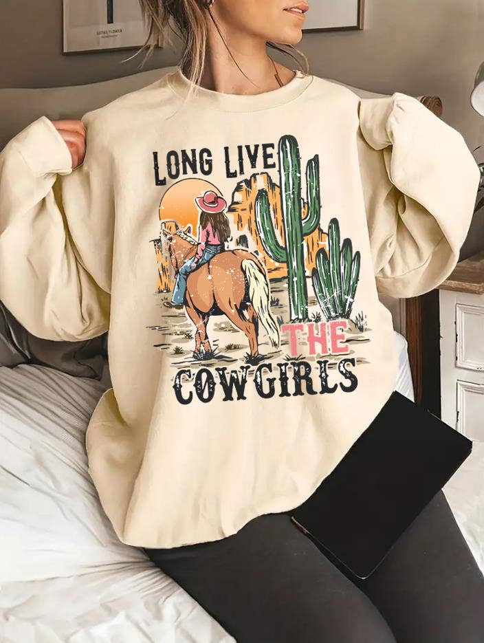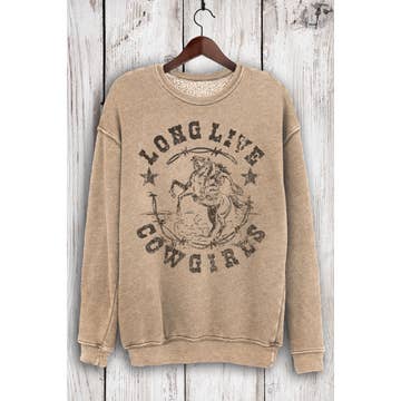 Saddle up with our Long Live Cowgirls Graphic Sweatshirt by Ali Dee features a unisex sweatshirt in heather grey with vintage inspired black screen printed art. Open Pack Pick Your Sizes Min of 8 units Designed and printed at our headquarters in the tiny town of Tolar, Texas, population 500. Cowgirl Graphic tee, Country graphic tee, western graphic tee, rodeo graphic tee, graphic tshirts, western themed shirt, western tshirt, graphic t-shirts for women, cute graphic tees, graphic sweatshirt, western sweatshirt, cowgirl sweatshirt