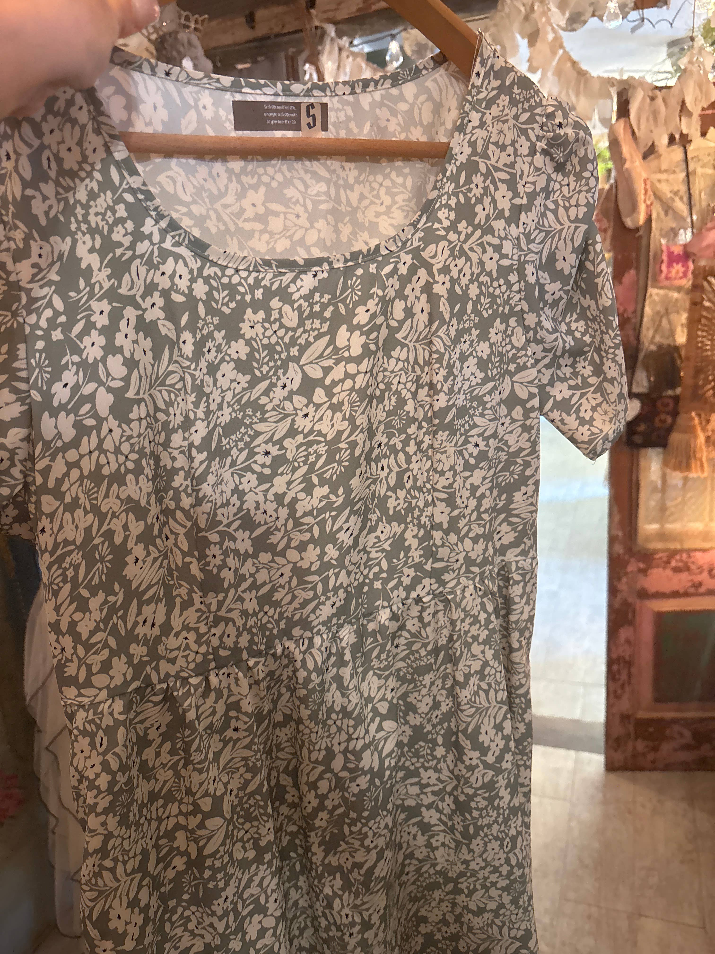 Made in United States Care Instructions: Machine wash Color: Green and Off-White Embellishment: Ruffles Neckline: Round neck Occasion Theme: Easter and Fourth of July Occasion: Bridal and Everyday Pattern: Floral Season: Spring/Summer Skirt & Dress Length: Knee Sleeve Length: Short Sleeve Product Language: English