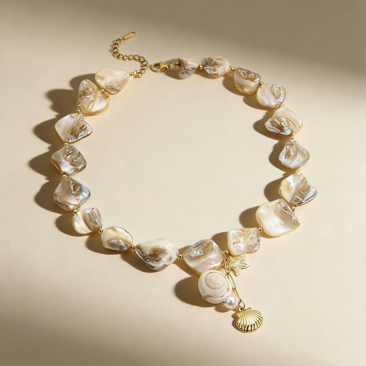 Charm Necklace, featuring a stunning combination of multi-sea shell, starfish, puka, and pearl charms. This playful yet elegant necklace brings together natural-inspired elements, each charm adding a unique touch that evokes beachy vibes and coastal beauty. Crafted with care, this necklace is perfect for adding a touch of the seaside to your look. Product Details: length: 17" charm: .25"- .75" ext: 3" Ball Chain Ext clasp: Lobster Claw metal finish: Gold Plated product: Lead & Nickel Compliant anti-tarnish: Double E-coating