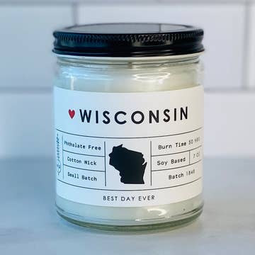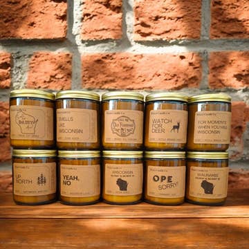 The Wisco Collection 8 oz amber jar soy candle. 50 hour burn time. Choose from our Wisconsin inspired scents and labels Wax - We use 100% soy wax with no additives. We use no dyes or uv additives ever in our process. Those things certainly make candles pretty but we don't think it's worth it to add chemicals to our candles. Wicks - our wicks are made with a compressed flat braided cotton core that is wrapped in paper. Fragrance - All of our oils are sourced from manufacturers that use no parabens or phthalates. They are also what are called "natural fragrance oils" which basically means they are made from isolates or the the natural aromatic components of the complex scent rather than synthetic chemicals. Candles cannot safely be made with essential oils. Packaging - all of our packaging and our containers are reusable or recyclable.