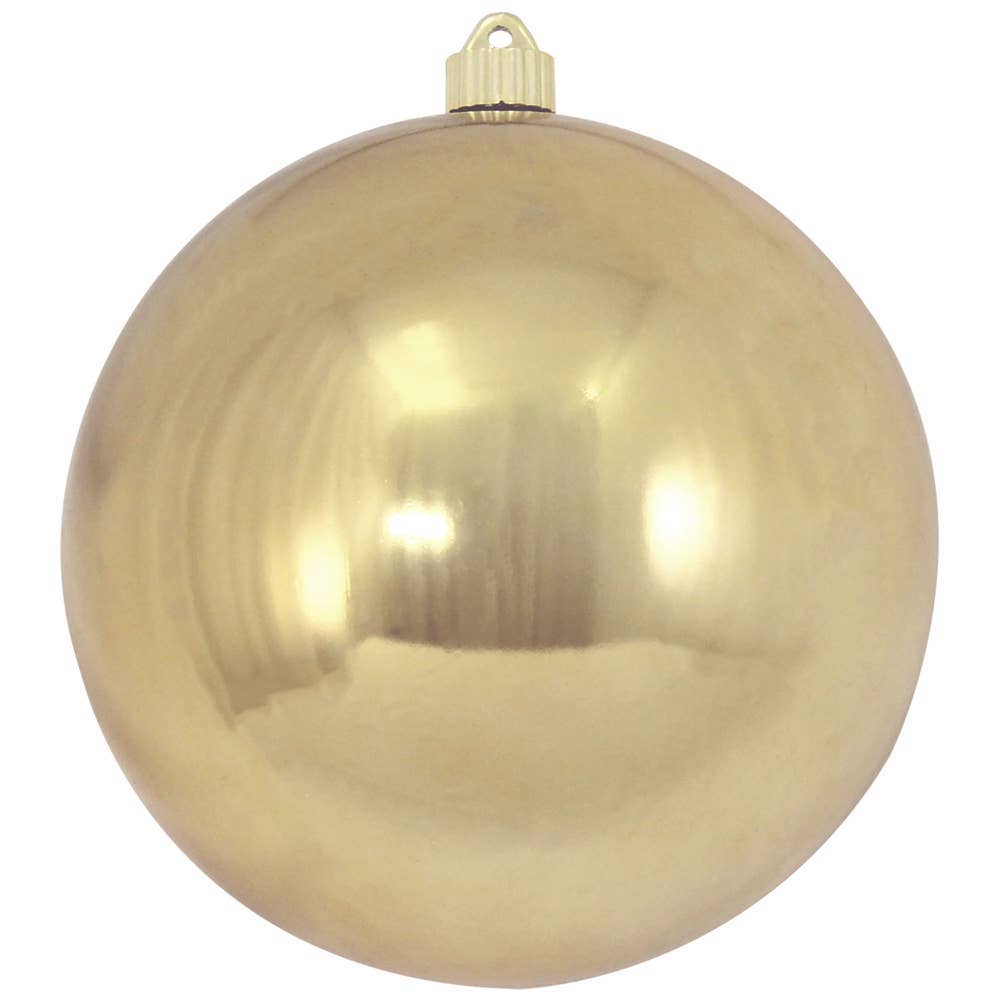 Vickerman 4.75" Gold Candy Ball Ornament. This item is made from shatterproof and UV resistant plastic for extended protection from fading and breaking. The cap is drilled and looped with floral wire to ensure it is reliable and ready to hang. This unique ornament is an exceptional addition to any collection as it matches well with a variety of décor and goes perfectly on a holiday tree. Includes 4 ornaments per pack.