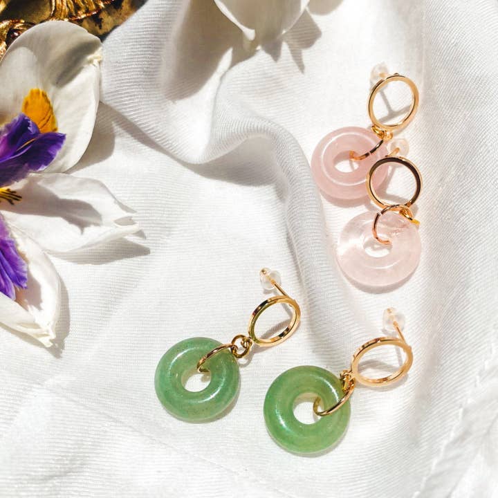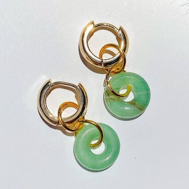 Your go-to jade-inspired hoops for Mon, Tues, Wed, Thurs, Fri, Sat, Sun. This is a 2-in-1 earring, the stone can be removed for a classic gold hoop! All jewelry by Lotus Haus Studio is ethically and slow-made in San Francisco. These are the perfect gift for the ethically-conscious shopper. Every piece is unique, therefore the beads and pearls may slightly vary Materials - Gold hoop: 20mm - Aventurine, Yellow Jade, and Rose Quartz - Stainless Steel, gold plated - Hypoallergenic Earring Care High quality sterling silver hoop earrings with premium e-coat for long lasting color and finish. E-coats also help in reducing allergies. The earrings are also lead and nickel free. In order to extend the life of your jewelry, please remove jewelry before swimming, exercising, and bathing.