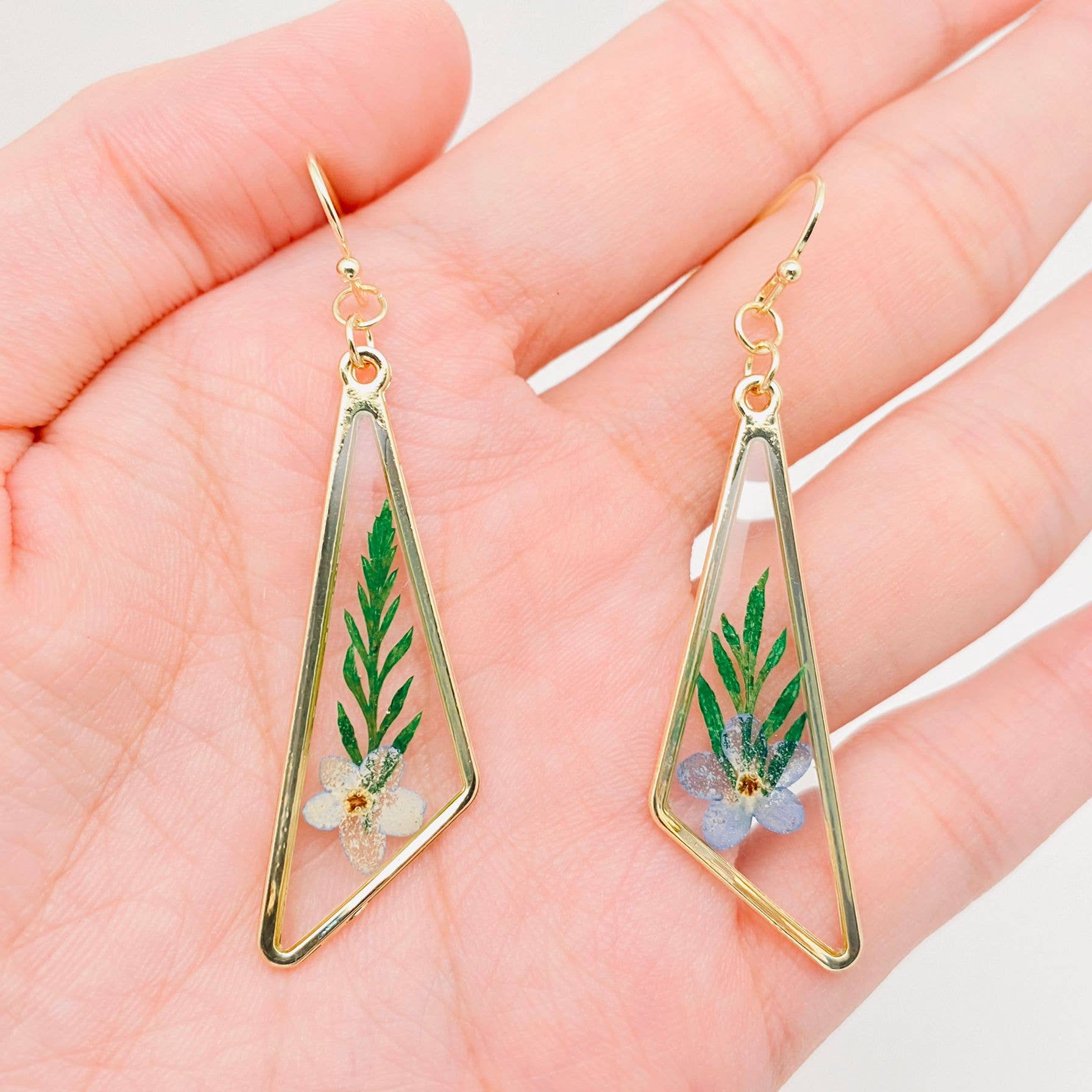 Gold and clear acrylic diamond bar earrings featuring dried ferns and light blue flower, a captivating fusion of nature and modern design. These earrings showcase a sleek gold diamond shape with transparent acrylic center, embedded with delicate dried ferns and blue dried flower. Embrace the enchanting allure of these earrings, a perfect accessory to add a touch of natural elegance to any outfit. * Made in China * Genuine pressed dried flower bar earrings * Measures: 2 1/4 x 1/2" * Materials: Gold Tone Metal, Acrylic, Genuine Dried Flowers