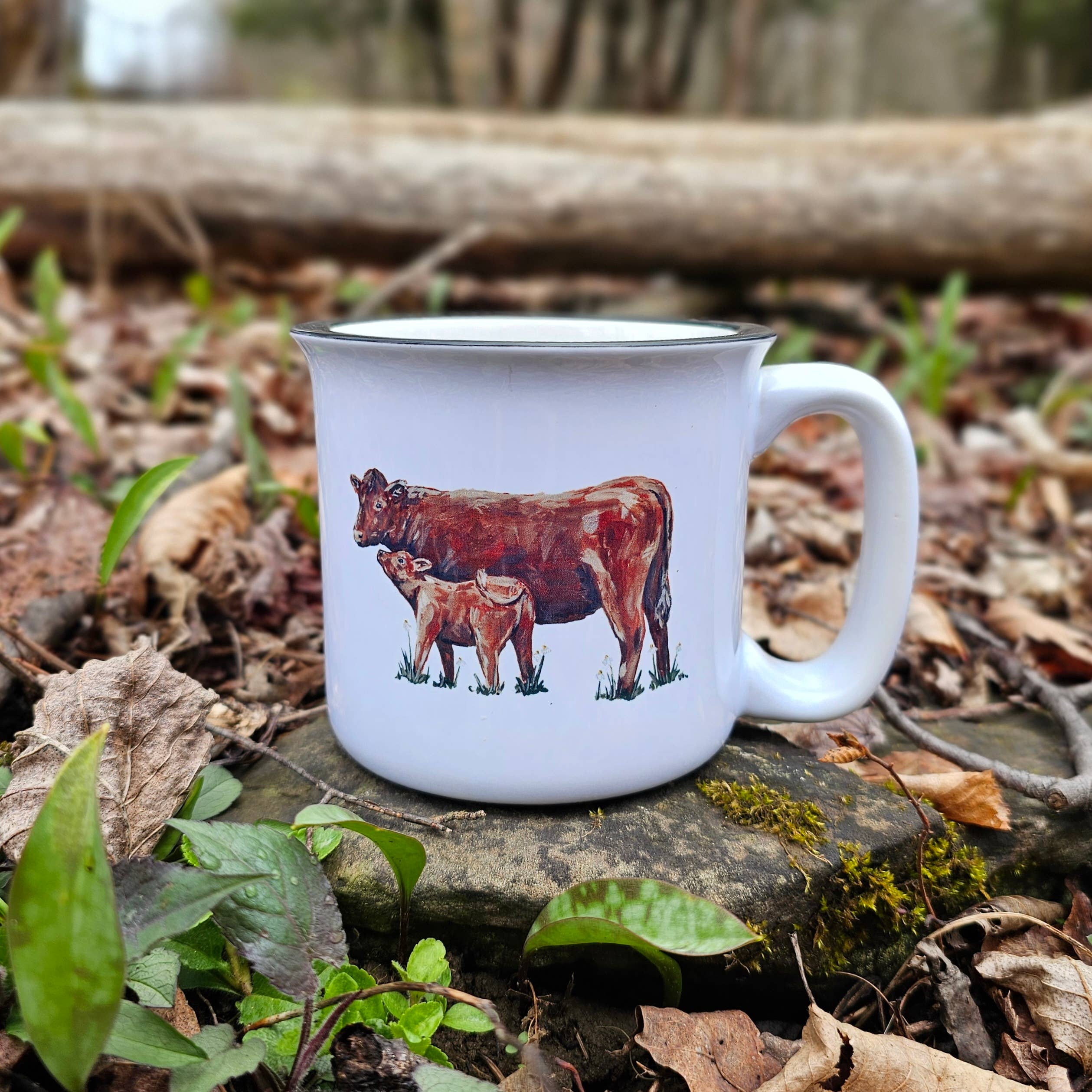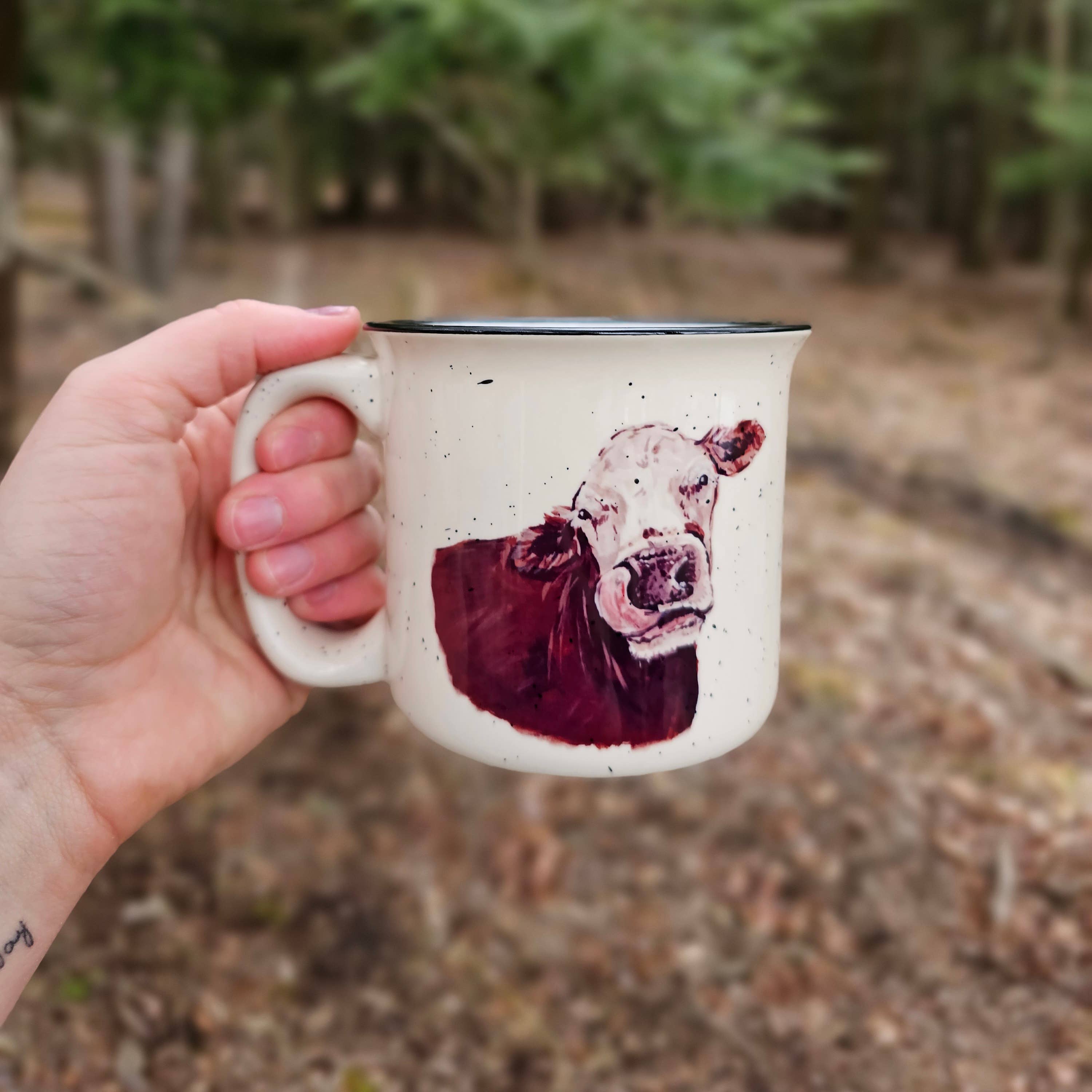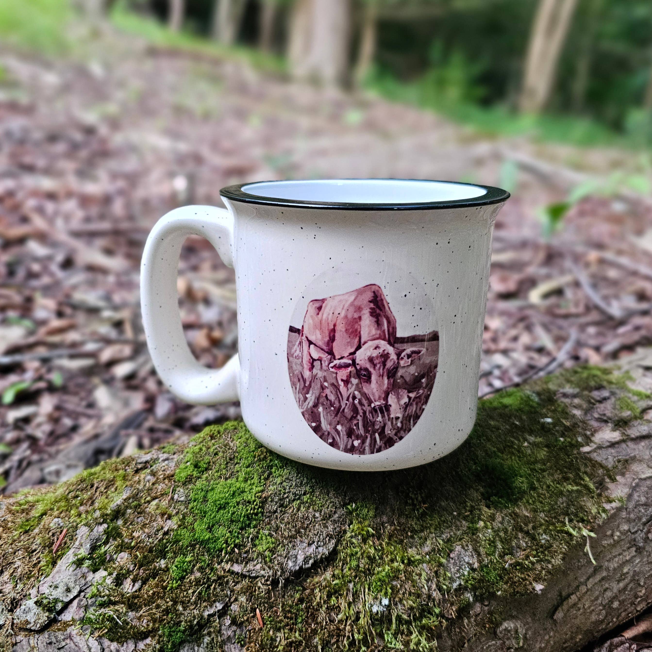 Cow Kiss Mug is made from my original paintings, perfect gift for the animal lover in your life! The image is on both sides of the mug. This mug holds 13oz of liquid, and is a nice sturdy ceramic camp mug. These mugs are made by hand in my studio using the sublimation process so the image is permanent on the mug and are dishwasher and microwave safe! The animal you see in this painting is from Sweet Farm- an animal sanctuary located in Himrod, NY. Sweet Farm is home to more than 150 rescued animals, each one of whom has a unique and special story. You can read some of their inspiring stories by going to their website, but they also invite you to get to know them in person at tours and events. Option to choose a white mug with the black rim, or a cream speckled mug with the black rim- as shown in photos. Please note for mug orders larger than 20 pieces, I may have to order more mug blanks which will extend production time.