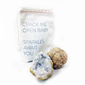Inside of each drawstring pouch is a rock. Crack the rock open with a hammer and the interior will reveal a geode crystal interior! This is a super fun and interactive gift - great for children and adults alike! INSTRUCTIONS - Safety first. Please be aware of your surroundings and select a non precious surface to break open your geode - Use a heavy duty standard hammer - One strong hit is better than soft knocks - Enjoy the surprise - every geode is unique! MATERIALS 100% Cotton drawstring pouch hand stamped with the words: CRACK ME OPEN BABY SPARKLES AWAIT YOU Included in each bag is a geode rock. Geodes come in three different sizes. please make your selection below. Small - cotton pouch measures 3x5" / rock measures roughly 1.5" - 2" Medium - cotton pouch measures 4x6" / rock measures roughly 2.5" Large - cotton pouch measures 5x8" / rock measures roughly 3" - 3.5" Note that each rock is one of a kind in size, shape, color and even the sparkly interior will vary from wha