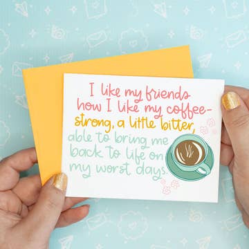 Hello Sunshine - Love and friendship card for coffee and flower lover - Size: A2 Card (4.25" x 5.5") printed on smooth 100lb matte card stock - Kraft envelope included - Inside of card is blank - Back of card has website, logo, sku etc. - Cards are individually packaged in a plant based eco-friendly biodegradable sleeve along with a sticker on the back letting your customers know that they are buying plastic free - Designed, Illustrated and printed in the USA by Nicole Christian - Design Studio LLC