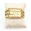 This round, best-selling brass bracelet is one size-fits (most) small-medium sized wrists with a 6.5 inch diameter. Hand stamped with 1.5mm, upper-case serif font letters 'FUCK IT.' Since these bracelets are 100% brass, they are very strong (pretty impossible to dent/bend or break) and will not turn color. The springy clip-open feature enables them to open to fit around the thin part of the wearer's wrist, without falling off; the oval shape provides a more comfortable wear.