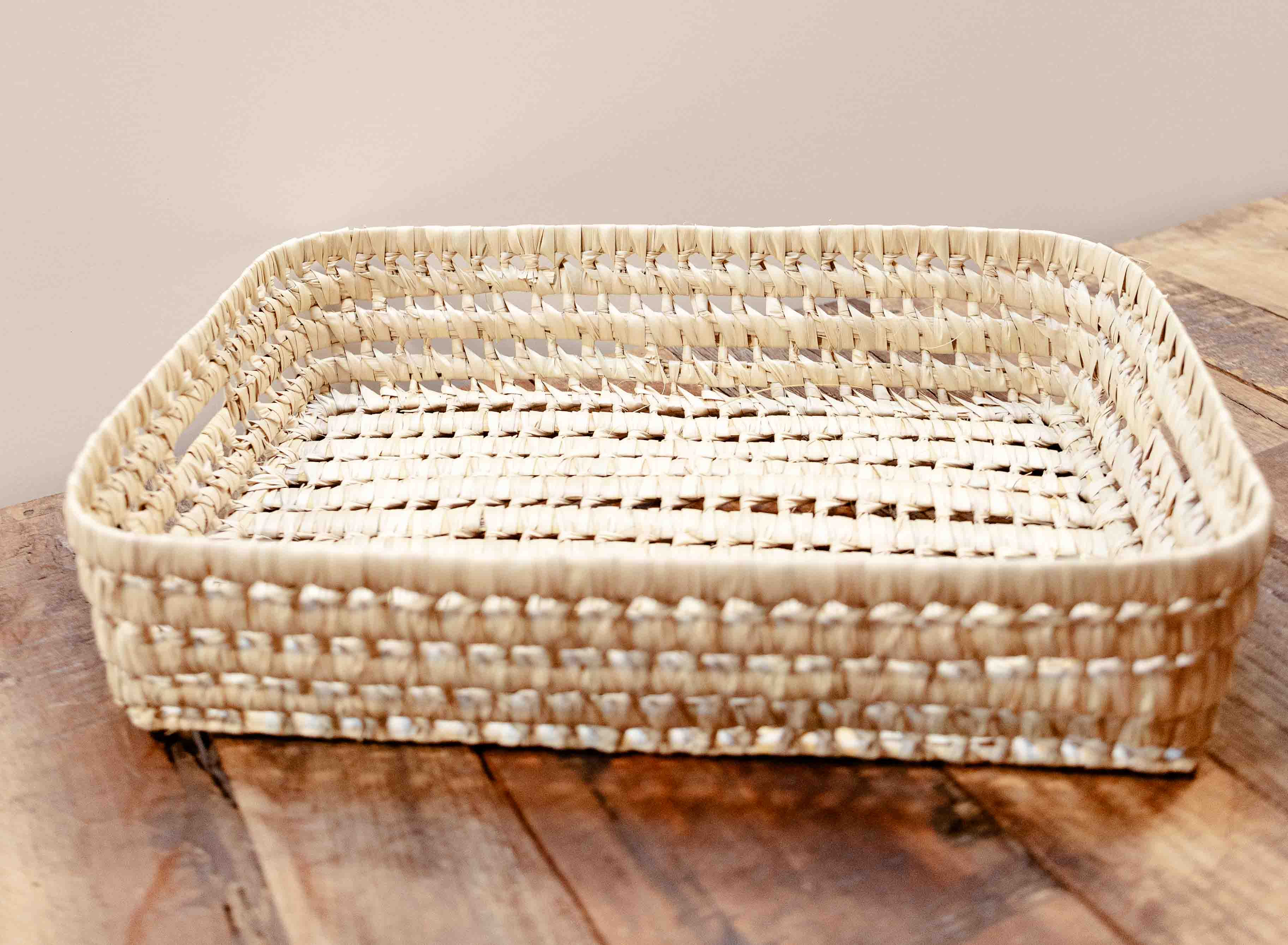 Lightweight and flexible Moses basket is perfect for all stages of a Littles life-- from newborn moving around the house with comfort, to toy storage- these are just a few of the ways our Moses basket can function in the home! These baskets are lovely and traditional, woven from palm in a weave traditionally found in Marrakesh using date palm. Line the basket with blankets to make it cozy for bebe or fill it with storage items for any room in the house. SKU: MOSES