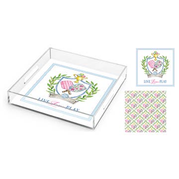 VOL 2 Julie is an amazing artist from Dallas, and she has raw talent. Her careful mix of colors create beautiful pieces of art, and I am thrilled to have another collaboration with her. **Acrylic trays are all the rage and are definitely on trend. Why should customers settle for one design when they can have TEN designs and change them out on a whim? The TAYLOR GRAY acrylic tray is an extra-large 11x17 tray that perfectly fit our 11x17 insert designs. The patent pending pocket on the bottom of the tray allows the inserts to be easily interchanged and protected. The acrylic is also food safe. The trays are functional, fabulous and extra-large. They are great for your bar cart, ottoman or even for makeup on your vanity. The options and designs are endless!