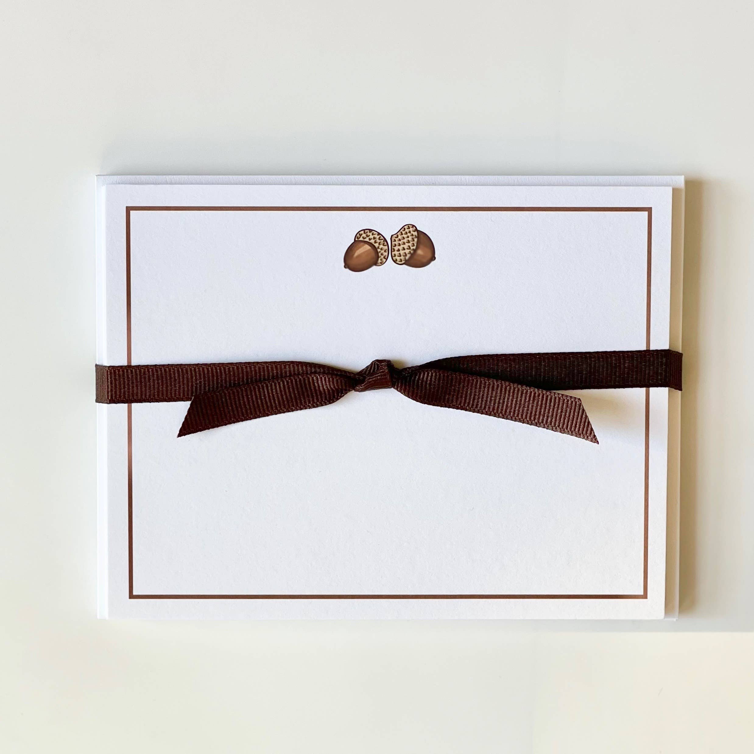 Set of 10 flat note cards and envelopes. 5.5 x 4.25". Tied with coordinating ribbon and packaged in clear bag. Ultra white paper stock