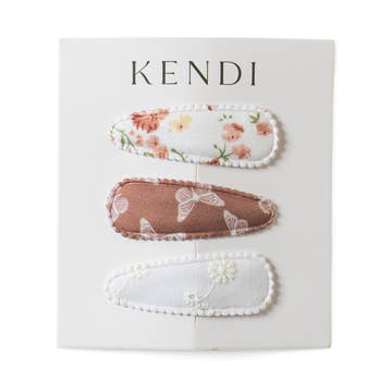 Kendi 3-Pack Hair Clip Set * Size: Approx 1 3/8 " x 5/8" * Stitch & print placement will not be exactly as shown in photo * Made in China * Cotton polyester blend