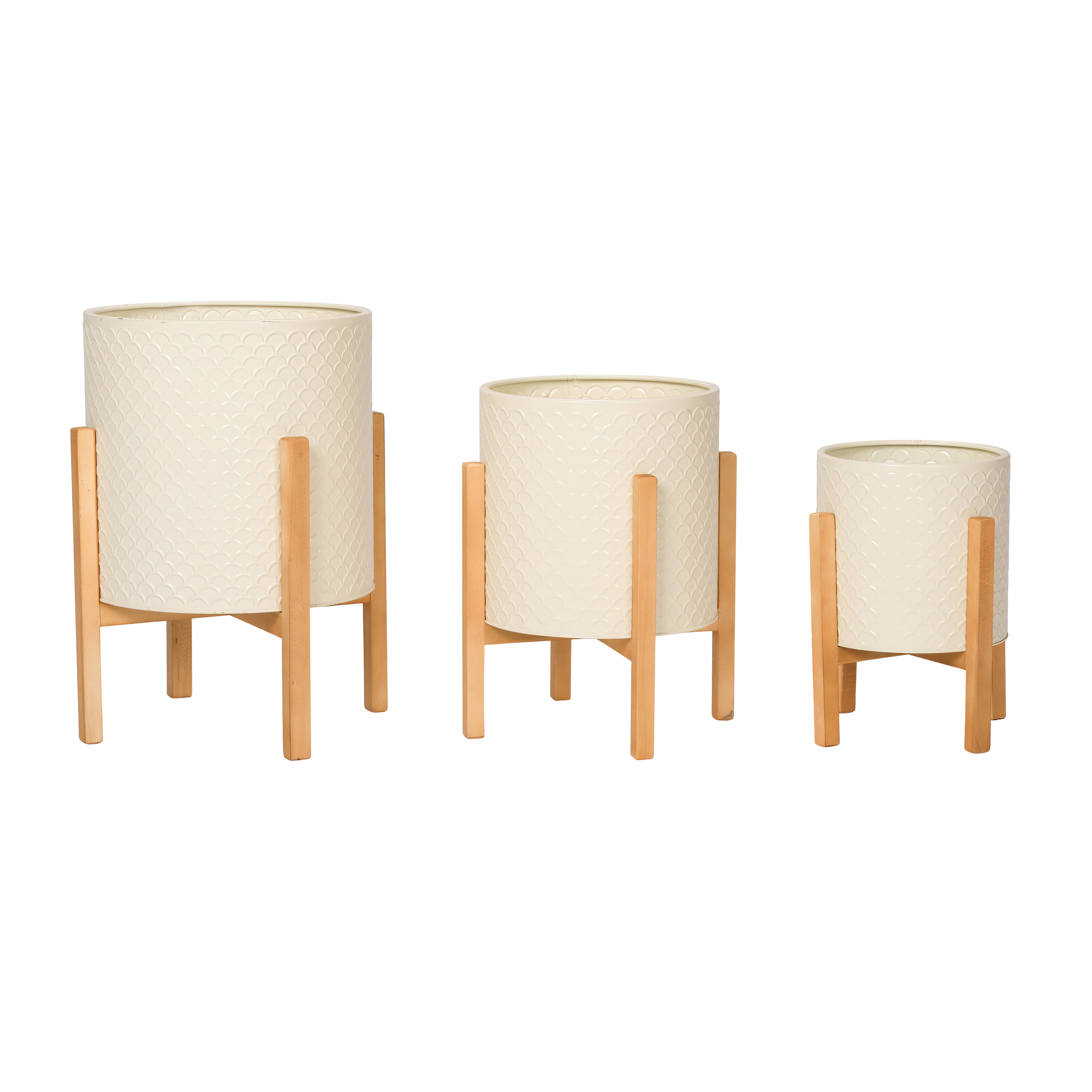 Paloma Modern Planters (Set of 2) Item Dimensions: 19"H x 11.5"W x 11.5"D / 15.5"H x 10"W x 10"D Set of two white and brown planters made from metal. Note that since these planters are made of metal, they are not recommended for direct planting. Best used by placing a potted plant inside the decorative planter. Recommended for indoor use only.