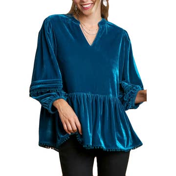 Wholesale Velvet V Neck Peplum Hem Puff Sleeve Blouse