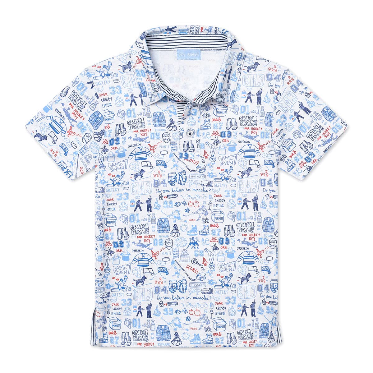 * 100% Pima Cotton, super soft and durable * Made in Peru * Navy stripe pocket, sleeves and neck trim * Machine wash cold; Tumble dry low * True to size fit