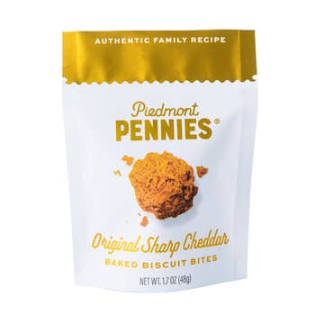 Brides love this size for wedding welcome bags, hotel bags, welcome gifts, party favors. Mom's love it for on-the-go road trip snack or teacher gift. Hosts love them for a gourmet treat to keep on hand for a quick charcuterie board or spur of the moment cocktail hour. Bite into the bold, cheesy goodness of Piedmont Pennies Cheese Crackers, a modern twist on the classic Southern cheese straw. Made in small batches with real sharp cheddar and a perfectly buttery crunch, these addictive little rounds come from a woman-owned company proudly based in North Carolina. Whether you’re building a charcuterie board, setting out a bar mix for cocktail hour, or searching for the perfect holiday snack, Piedmont Pennies deliver flavor that pairs effortlessly with wine, craft beer, or your favorite cocktails. They’re equally at home as bar cart essentials, slipped into stocking stuffers, or wrapped up as thoughtful hostess gifts. Why our customers love them: - Authentic cheesy flavor baked into every bite. - The perfect crunchy cracker for snacking or entertaining. - Made in North Carolina by a woman-owned business. - Ideal for gifting, parties, and everyday treats. - A Southern tradition reimagined for modern snack lovers. Bring home Piedmont Pennies Cheese Crackers and enjoy the taste of real cheddar baked into the ultimate savory treat. Perfect for sharing—or not! Product Details: - Original Sharp Cheddar Flavor - 1.7 oz each, 25 units per case - $2.30 wholesale, $3.99 retail - Resealable personal snack size - 1 year shelf life Indulge in our Small Pouches, featuring crispy, crunchy Piedmont Pennies cheesy biscuit crackers. Each crunchy bite is a homemade delight that will transport you to the comforts of home. Perfect for snacking or as a gift, our pouches are always fresh and full of flavor!