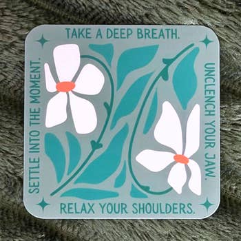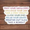 Help your customers pause and breathe with this uplifting mindfulness sticker. Featuring a rainbow-colored message to drop shoulders, unclench the jaw, and relax, it’s a perfect daily reminder for reducing stress and promoting calm. Sized at about 2.76 inches wide, this durable vinyl sticker is ideal for laptops, journals, water bottles, or workspaces. Great for boutiques, bookstores, wellness shops, and gift retailers looking to offer thoughtful, mental-health inspired items.