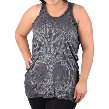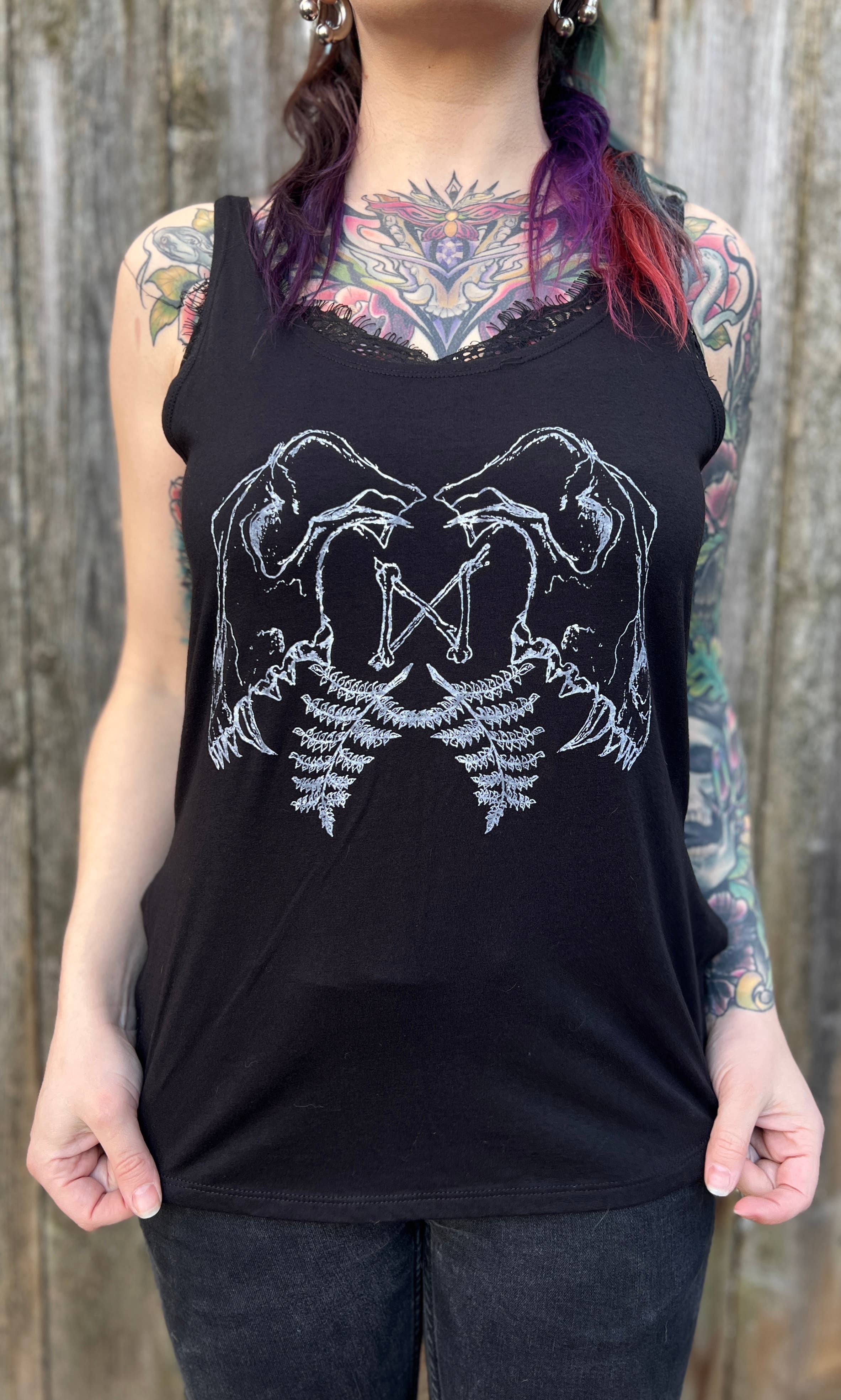 The design was drawn and printed by me. Extremely soft women's cut flowy tank. This tank runs true to size. Hand printed with a white water based eco friendly ink. 65% poly 35% viscose SIZE CHART (in inches) LENGTH BUST(LAID FLAT) XS 22 1/4 16 5/8 S 25 3/4 17 5/8 M 26 1/4 18 5/8 L 26 3/4 19 5/8 XL 27 1/4 21 1/8 XXL 27 3/4 22 5/8 For best results, wash cold delicate, hang to dry.