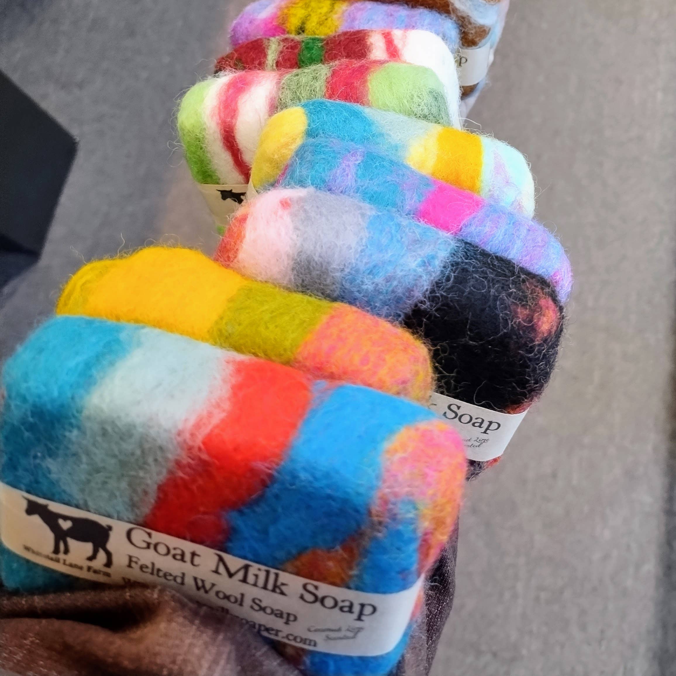 A cleansing and exfoliating washcloth and GOAT MILK SOAPĀ all in one! Felted Soaps come in a random assortment of colors - Choose the scent that you would like within the drop down menu. If you are looking for PRIVATE LABEL felted soap see this listing: https://www.faire.com/product/p_mhueqsden7 Felted soap is simply a bar of our goat milk soap wrapped in wool roving. The wool is naturally antimicrobial and makes the soap less slippery. It's very gently exfoliating, and can replace a washcloth or bath pouf in the shower.Ā You are left with an felt scrubber perfect for use during cleaning. It is 100% biodegradable. Ingredients: Raw Goat Milk, Olive Oil, Coconut oil, Palm Oil, Sodium Hydroxide, Avocado Oil, Castor Oil, Shea Butter, Fragrance (paraben-free and phthalate-free), Colorant (Mica Powder), Naturaly Dyed Wool Roving. Each bar soap weighs approximately 4.3 ounces and is roughly 3.125ā x 2.125ā x 1ā. Price is per soap bar.