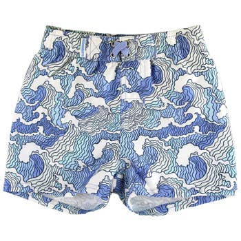 Drawstring closure and scalloped edging. Adjustable elastic band inside of boardshorts. Care: Machine wash on delicate cycle Tumble dry low.