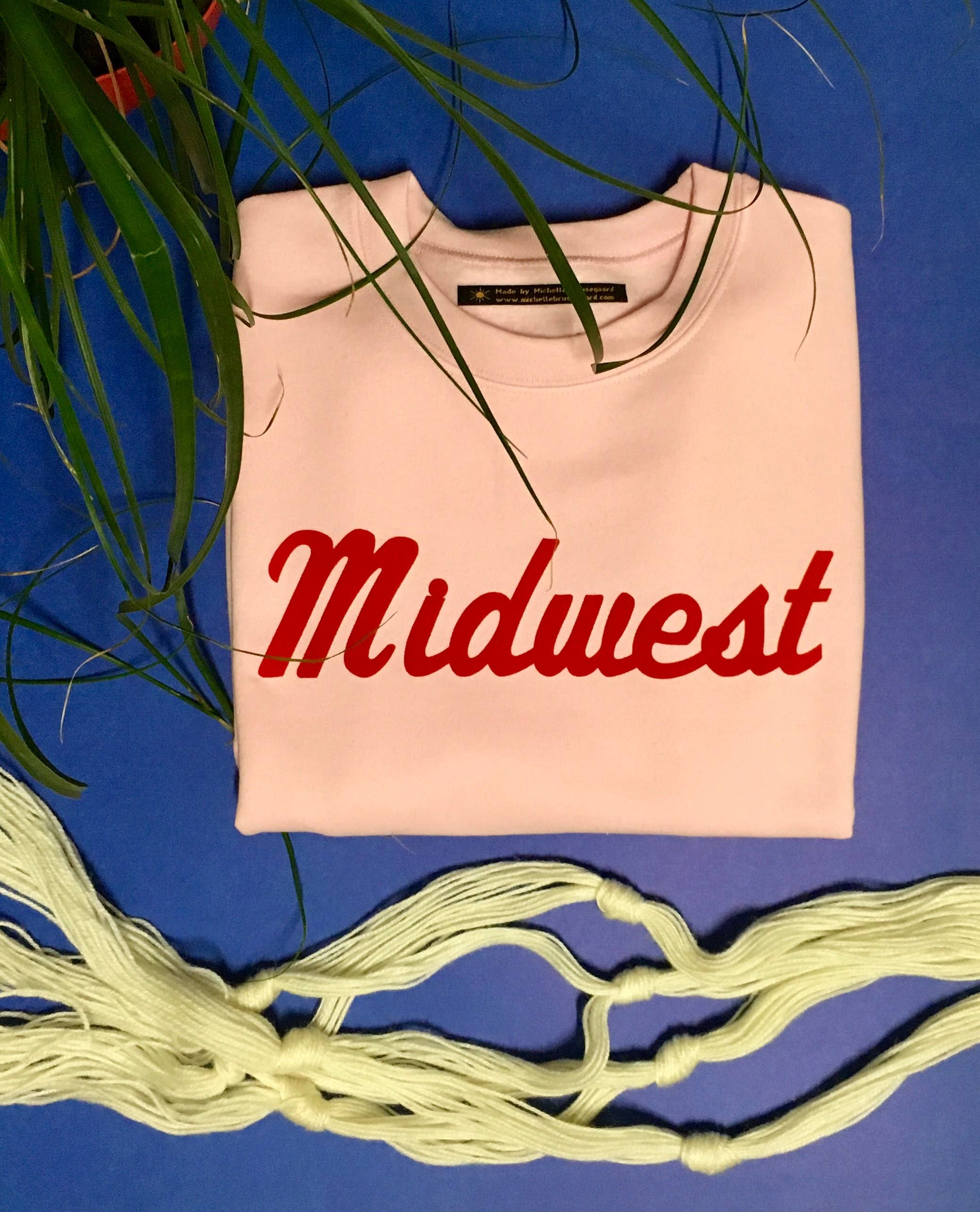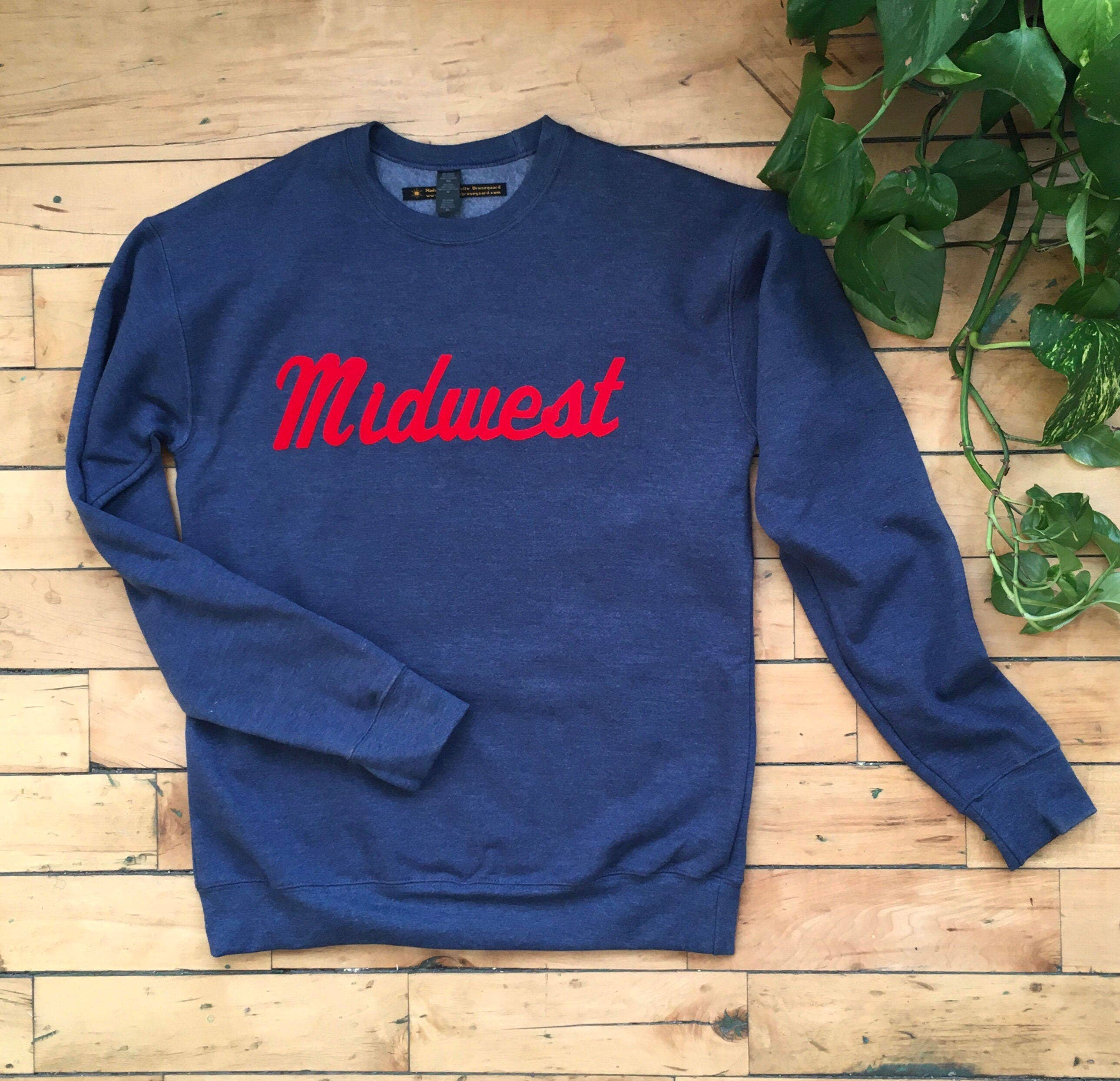 You’re midwestern and you’re so darn proud, you want to wear a sweatshirt about it! This print is flocked (think fuzzy, velvety, rubbing-your-shirt-a-little-too much soft) in bright red script. The sweatshirt color is called heather denim. Unisex/men’s sizing fabric 7.5 Oz. Fleece 80% ring-spun cotton/20% polyester reactive-dyed for longer-lasting color side-seamed, drop shoulders with crew neck ribbed cuffs, neckline, and waistband with 5% spandex tear anywhere label