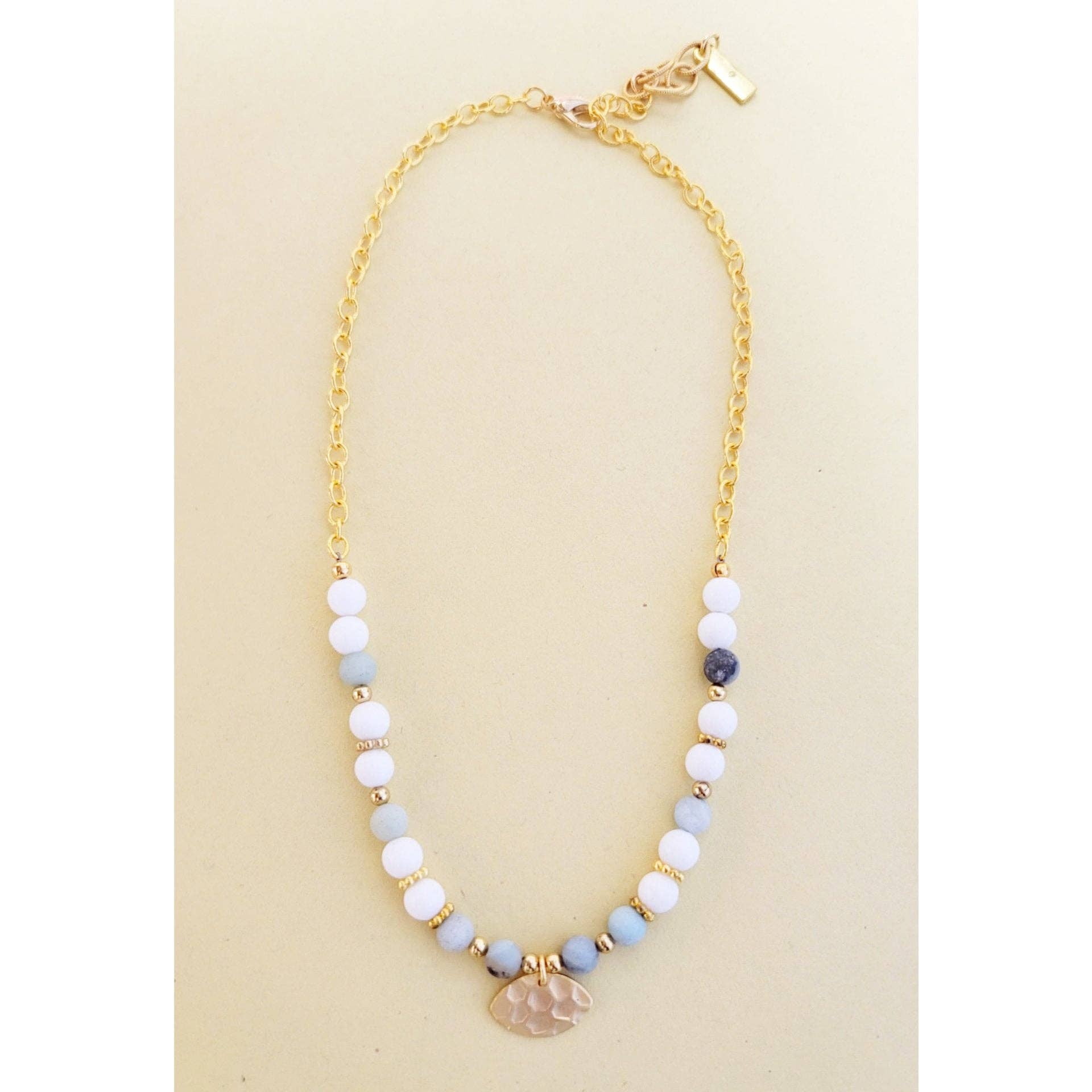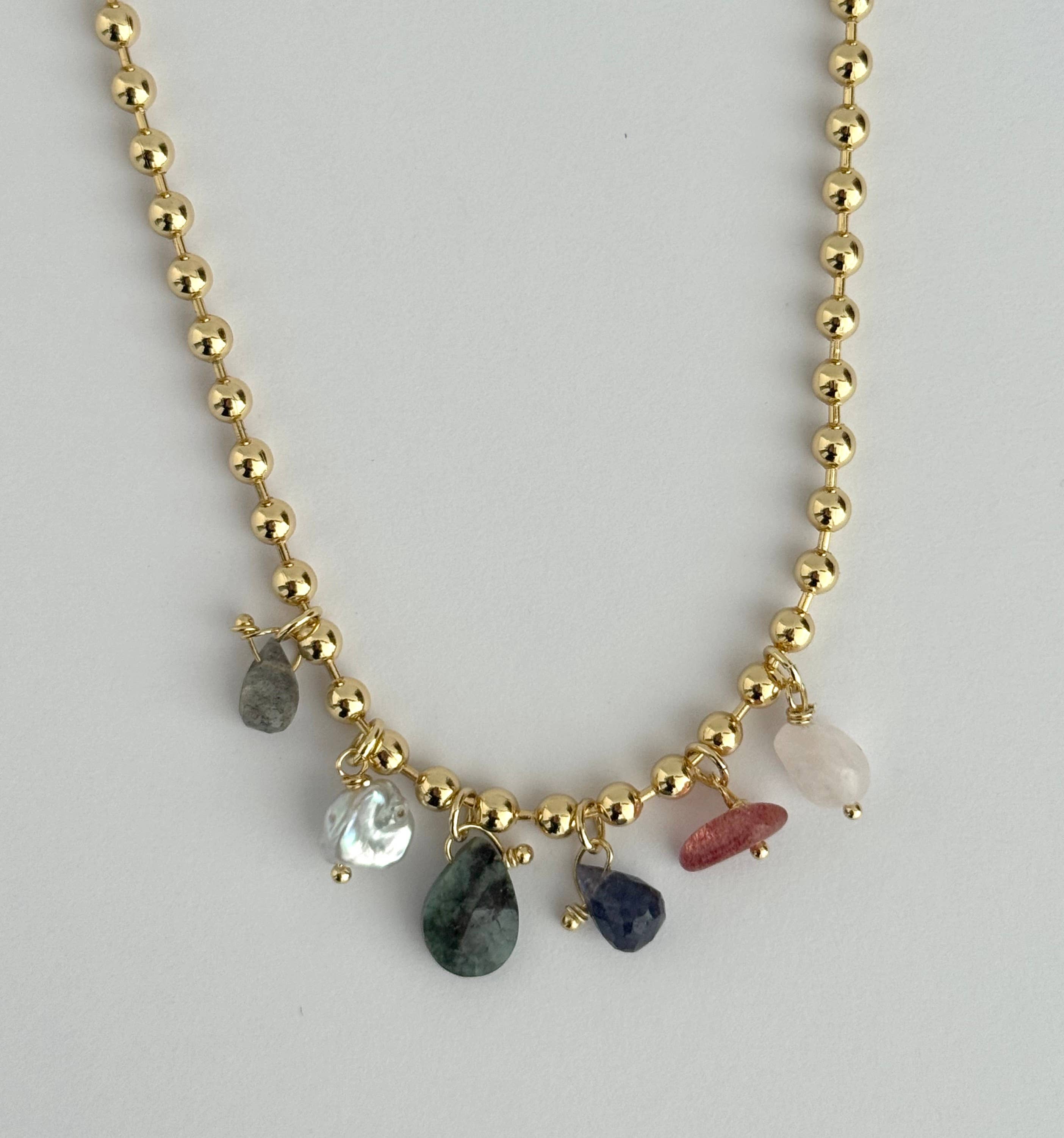 Adorn your neck with this gorgeous statement necklace, featuring faceted gemstones of clear quartz, labradorite, smoky quartz, and citrine, all with dazzling gold-plated accents. Length is adjustable from 18-20”.